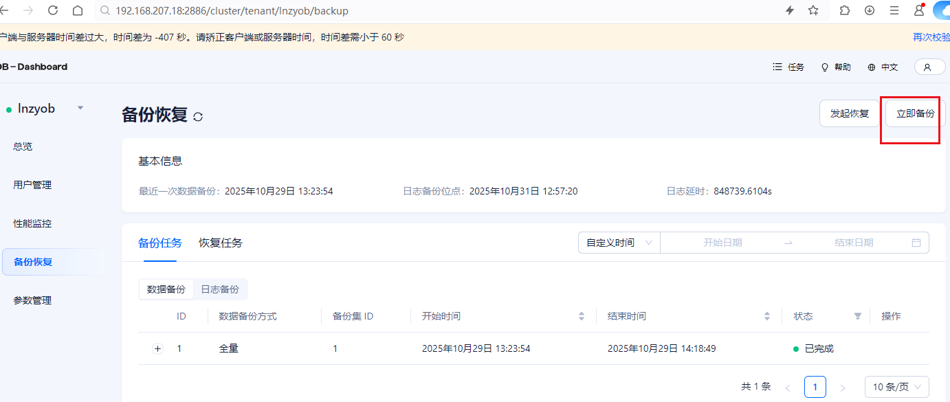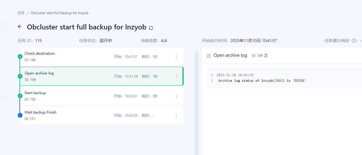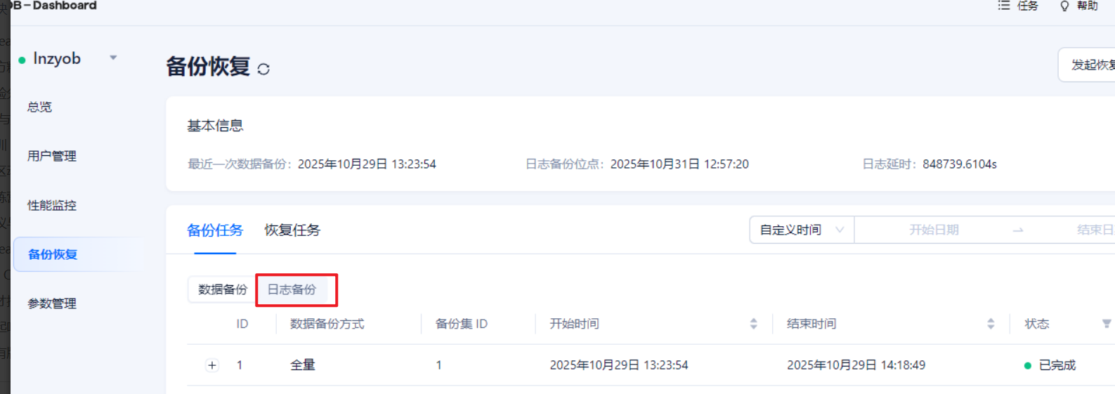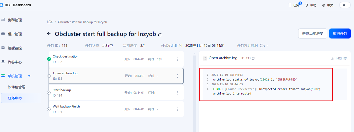 | 1002 | 1002 | 1 | 1 | 0 | INTERRUPTED | 1761715421691145000 | 2025-10-29 13:23:41.691145 | 1761886640389579004 | 2025-10-31 12:57:20.389579 | 1 | 1 | 2 | 86400000000 | 1 | none | 872067179 | 831.67MB | 872067179 | 831.67MB | 1.00 | 0 | 0.00MB | 0 | 0.00MB | file:///backup/lnzyob/log | log stream 1 interrupted |