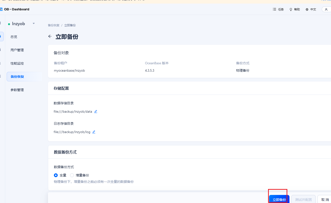 obclient(root@sys)[oceanbase]> ALTER SYSTEM SET data_backup_dest='file:///backup/lnzyob/arch';