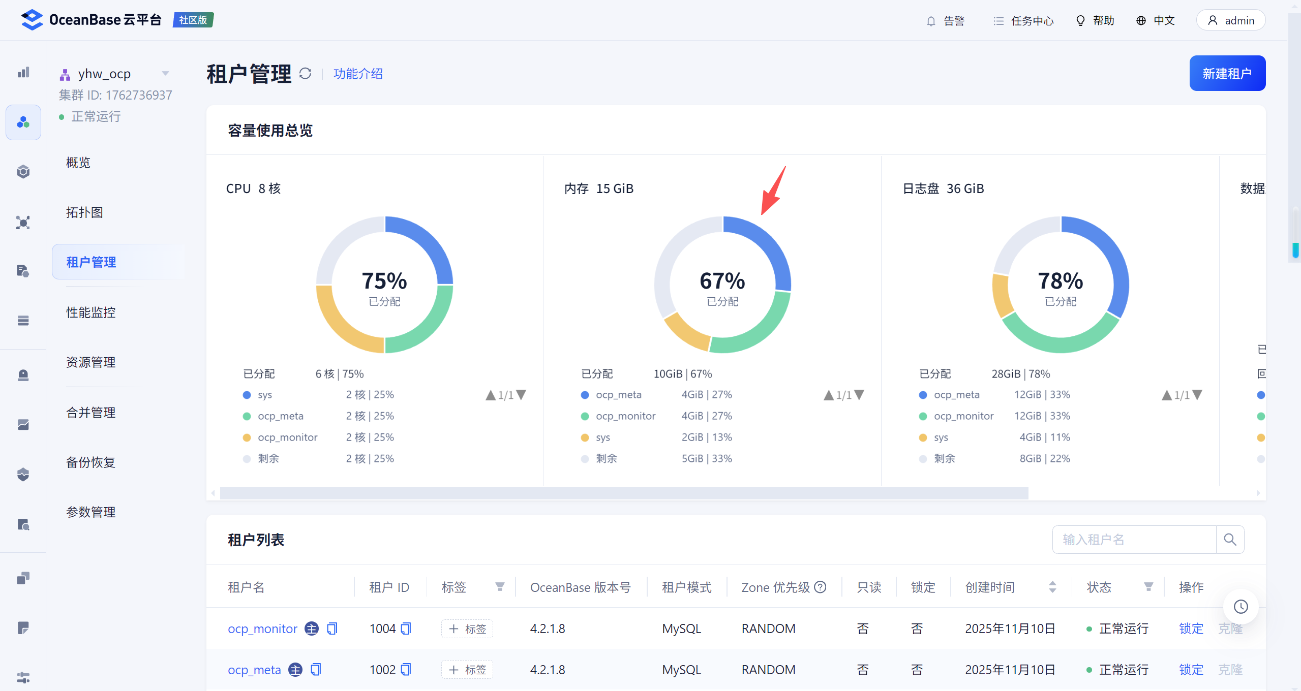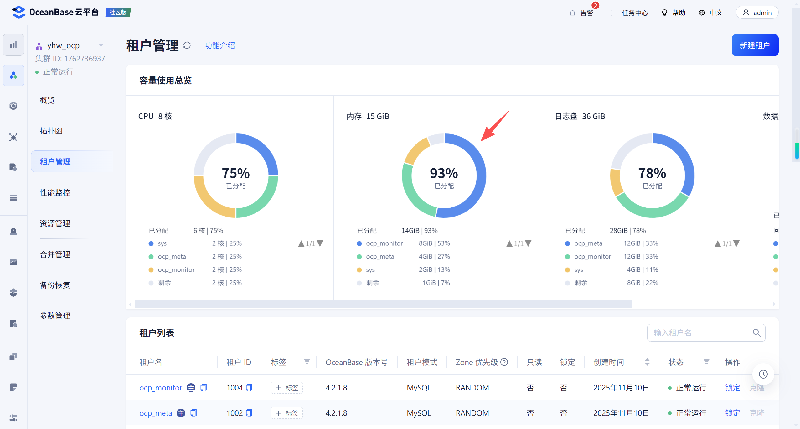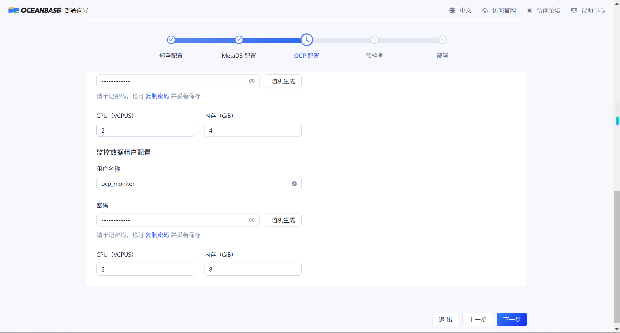 之前部署OCP的时候,在MetaDB配置租户ocp_monitor的时候,是将内存调整到了4G的(默认8G),如果按照默认方式配置则会在预检查是出现报错: