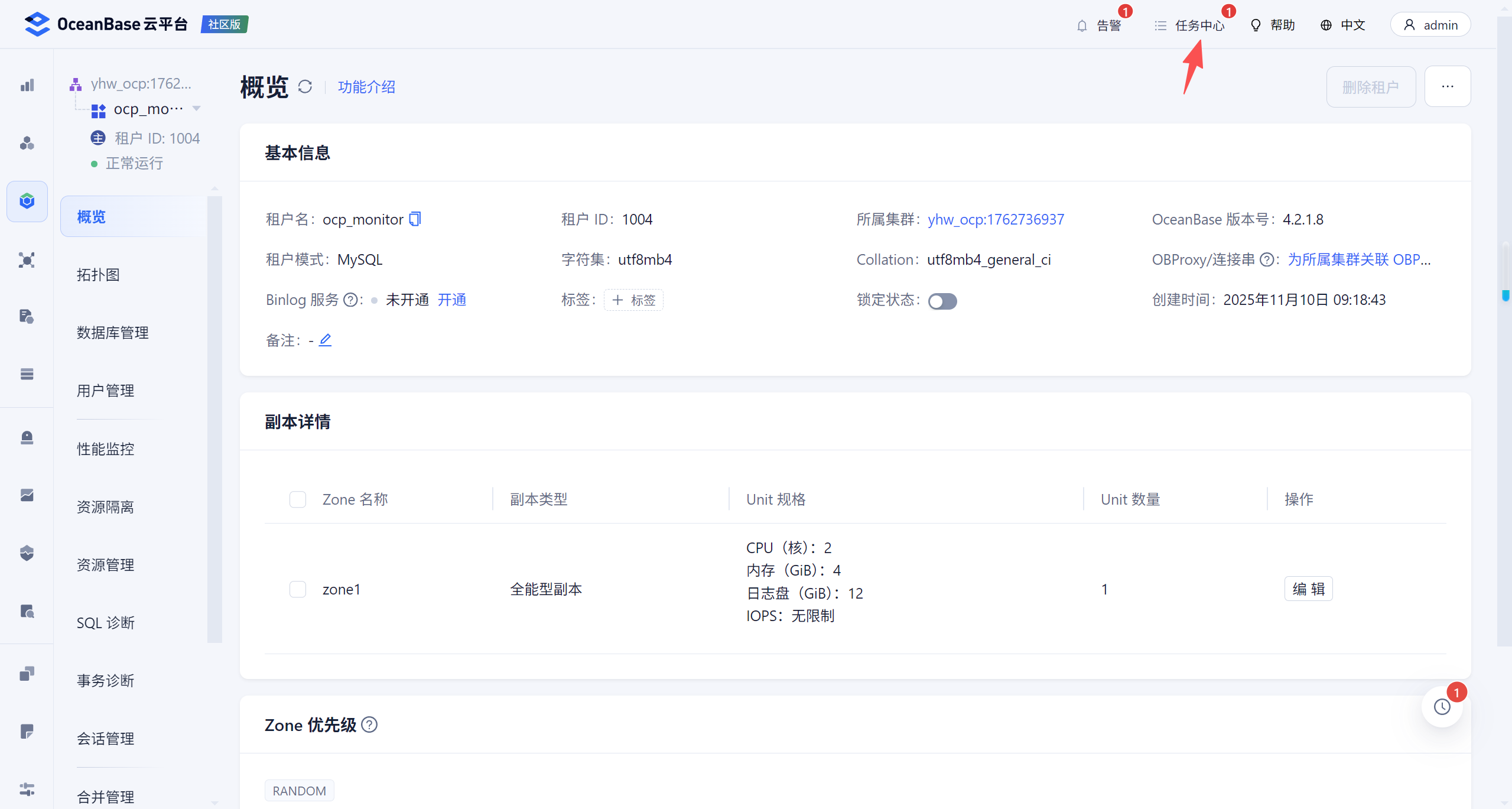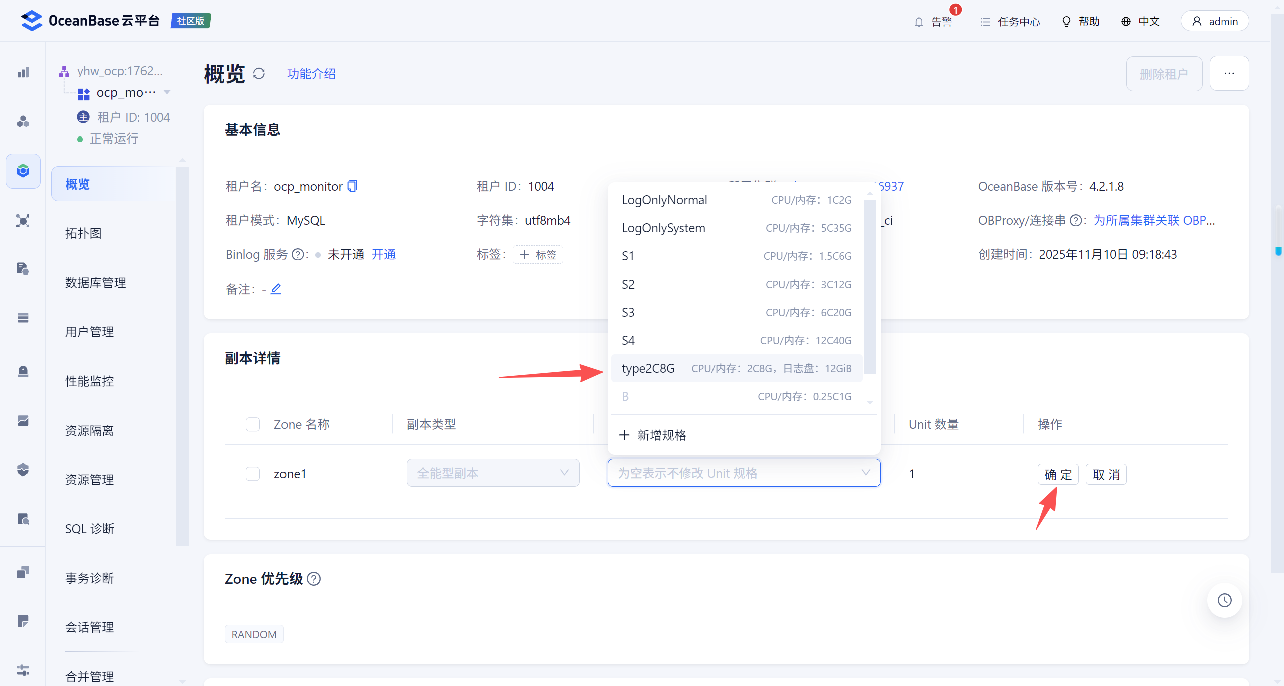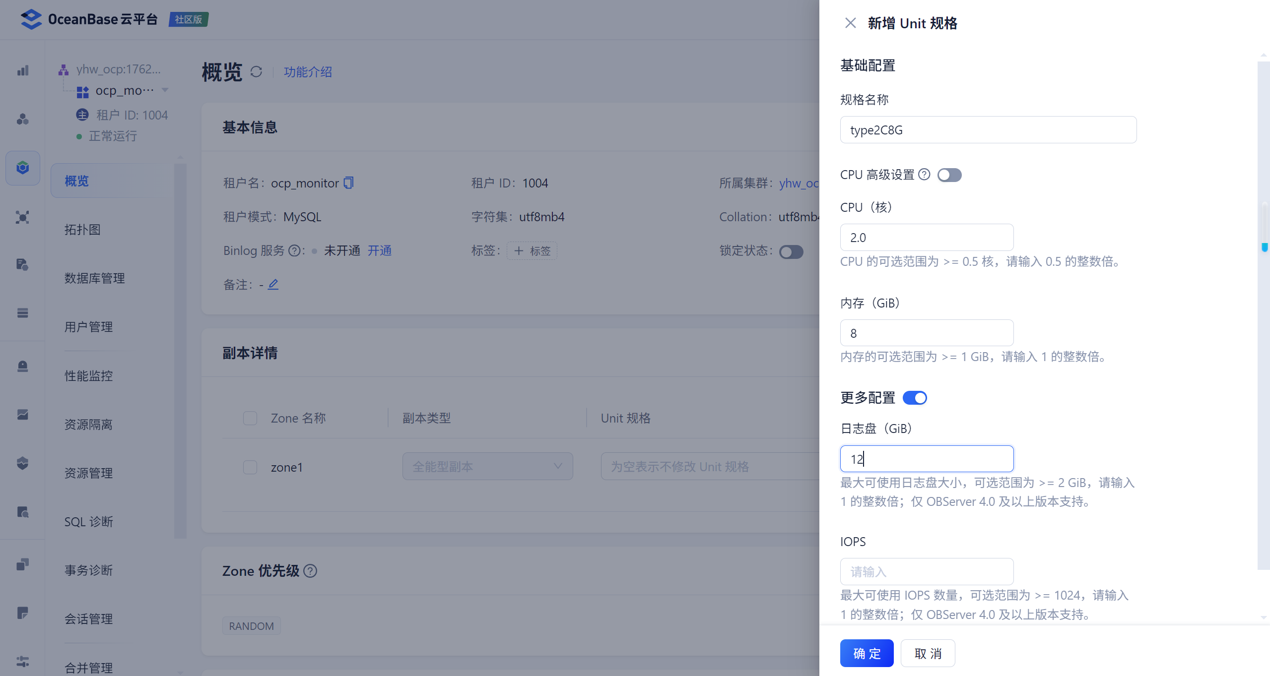 之前部署OCP的时候,在MetaDB配置租户ocp_monitor的时候,是将内存调整到了4G的(默认8G),如果按照默认方式配置则会在预检查是出现报错: