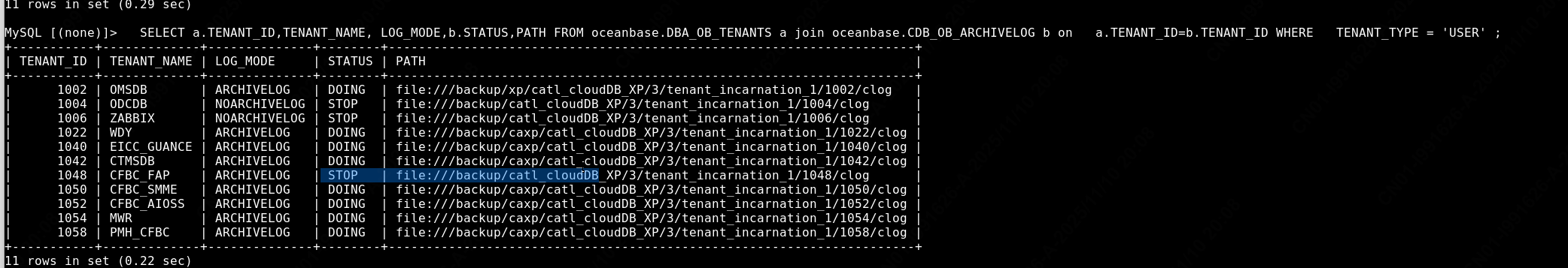 MySQL [(none)]> SELECT a.TENANT_ID,TENANT_NAME, LOG_MODE,PATH FROM oceanbase.DBA_OB_TENANTS a join oceanbase.CDB_OB_ARCHIVELOG b on a.TENANT_ID=b.TENANT_ID WHERE TENANT_TYPE = ‘USER’ ;