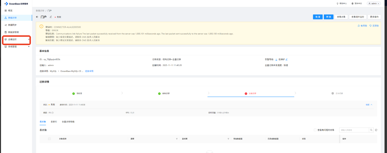 [2025-11-11 12:16:11.635] [ERROR] [main] [CommunicationsException, druid version 1.2.9, jdbcUrl : jdbc:mysql://172.25.228.4:3309?useUnicode=true&rewriteBatchedStatements=true&connectTimeout=30000&socketTimeout=1800000&allowMultiQueries=true&characterEncoding=utf8&netTimeoutForStreamingResults=28800&useSSL=false, testWhileIdle true, idle millis 1800123, minIdle 0, poolingCount 0, timeBetweenEvictionRunsMillis 10000, lastValidIdleMillis 1800123, driver com.mysql.jdbc.Driver, exceptionSorter com.oceanbase.oms.dataflow.datasource.druid.AbstractDruidDataSource$1][2025-11-11 12:16:11.638] [ERROR] [main] [notifyStopped:]com.mysql.jdbc.exceptions.jdbc4.CommunicationsException: Communications link failureThe last packet successfully received from the server was 1,800,101 milliseconds ago. The last packet sent successfully to the server was 1,800,100 milliseconds ago. at sun.reflect.NativeConstructorAccessorImpl.newInstance0(Native Method) at sun.reflect.NativeConstructorAccessorImpl.newInstance(NativeConstructorAccessorImpl.java:62) at sun.reflect.DelegatingConstructorAccessorImpl.newInstance(DelegatingConstructorAccessorImpl.java:45) at java.lang.reflect.Constructor.newInstance(Constructor.java:423) at com.mysql.jdbc.Util.handleNewInstance(Util.java:425) at com.mysql.jdbc.SQLError.createCommunicationsException(SQLError.java:990) at com.mysql.jdbc.MysqlIO.reuseAndReadPacket(MysqlIO.java:3562) at com.mysql.jdbc.MysqlIO.reuseAndReadPacket(MysqlIO.java:3462) at com.mysql.jdbc.MysqlIO.checkErrorPacket(MysqlIO.java:3905) at com.mysql.jdbc.MysqlIO.sendCommand(MysqlIO.java:2530) at com.mysql.jdbc.MysqlIO.sqlQueryDirect(MysqlIO.java:2683) at com.mysql.jdbc.ConnectionImpl.execSQL(ConnectionImpl.java:2495) at com.mysql.jdbc.PreparedStatement.executeInternal(PreparedStatement.java:1903) at com.mysql.jdbc.PreparedStatement.executeQuery(PreparedStatement.java:2011) at com.alibaba.druid.pool.DruidPooledPreparedStatement.executeQuery(DruidPooledPreparedStatement.java:227) at com.oceanbase.oms.dataflow.jdbcclient.mysqlbased.AbstractMysqlJDBCClient.getTablesInner(AbstractMysqlJDBCClient.java:661) at com.oceanbase.oms.dataflow.jdbcclient.mysqlbased.mysql.MysqlJDBCClient.getTables(MysqlJDBCClient.java:361) at com.oceanbase.oms.dataflow.jdbcclient.mysqlbased.mysql.MysqlJDBCClient.getTables(MysqlJDBCClient.java:319) at com.oceanbase.oms.connector.source.dataflow.ConditionTableSearcher.searchTables(ConditionTableSearcher.java:25) at com.oceanbase.oms.connector.source.dataflow.DataFlowSourceBooster.getAllTables(DataFlowSourceBooster.java:367) at com.oceanbase.oms.connector.source.dataflow.DataFlowSourceBooster.initSourceEnv(DataFlowSourceBooster.java:156) at com.oceanbase.oms.connector.source.dataflow.DataFlowSourceBooster.initSourceEnv(DataFlowSourceBooster.java:124) at com.oceanbase.oms.connector.coordinator.BootStrapPanel.boot(BootStrapPanel.java:194) at com.oceanbase.oms.connector.jdbc.coordinator.Bootstrap.main(Bootstrap.java:44)Caused by: java.net.SocketTimeoutException: Read timed out at java.net.SocketInputStream.socketRead0(Native Method) at java.net.SocketInputStream.socketRead(SocketInputStream.java:116) at java.net.SocketInputStream.read(SocketInputStream.java:171) at java.net.SocketInputStream.read(SocketInputStream.java:141) at com.mysql.jdbc.util.ReadAheadInputStream.fill(ReadAheadInputStream.java:101) at com.mysql.jdbc.util.ReadAheadInputStream.readFromUnderlyingStreamIfNecessary(ReadAheadInputStream.java:144) at com.mysql.jdbc.util.ReadAheadInputStream.read(ReadAheadInputStream.java:174) at com.mysql.jdbc.MysqlIO.readFully(MysqlIO.java:3011) at com.mysql.jdbc.MysqlIO.reuseAndReadPacket(MysqlIO.java:3472) … 17 common frames omitted[2025-11-11 12:16:11.662] [ERROR] [main] [main thread error]com.mysql.jdbc.exceptions.jdbc4.CommunicationsException: Communications link failureThe last packet successfully received from the server was 1,800,101 milliseconds ago. The last packet sent successfully to the server was 1,800,100 milliseconds ago. at sun.reflect.NativeConstructorAccessorImpl.newInstance0(Native Method) at sun.reflect.NativeConstructorAccessorImpl.newInstance(NativeConstructorAccessorImpl.java:62) at sun.reflect.DelegatingConstructorAccessorImpl.newInstance(DelegatingConstructorAccessorImpl.java:45) at java.lang.reflect.Constructor.newInstance(Constructor.java:423) at com.mysql.jdbc.Util.handleNewInstance(Util.java:425) at com.mysql.jdbc.SQLError.createCommunicationsException(SQLError.java:990) at com.mysql.jdbc.MysqlIO.reuseAndReadPacket(MysqlIO.java:3562) at com.mysql.jdbc.MysqlIO.reuseAndReadPacket(MysqlIO.java:3462) at com.mysql.jdbc.MysqlIO.checkErrorPacket(MysqlIO.java:3905) at com.mysql.jdbc.MysqlIO.sendCommand(MysqlIO.java:2530) at com.mysql.jdbc.MysqlIO.sqlQueryDirect(MysqlIO.java:2683) at com.mysql.jdbc.ConnectionImpl.execSQL(ConnectionImpl.java:2495) at com.mysql.jdbc.PreparedStatement.executeInternal(PreparedStatement.java:1903) at com.mysql.jdbc.PreparedStatement.executeQuery(PreparedStatement.java:2011) at com.alibaba.druid.pool.DruidPooledPreparedStatement.executeQuery(DruidPooledPreparedStatement.java:227) at com.oceanbase.oms.dataflow.jdbcclient.mysqlbased.AbstractMysqlJDBCClient.getTablesInner(AbstractMysqlJDBCClient.java:661) at com.oceanbase.oms.dataflow.jdbcclient.mysqlbased.mysql.MysqlJDBCClient.getTables(MysqlJDBCClient.java:361) at com.oceanbase.oms.dataflow.jdbcclient.mysqlbased.mysql.MysqlJDBCClient.getTables(MysqlJDBCClient.java:319) at com.oceanbase.oms.connector.source.dataflow.ConditionTableSearcher.searchTables(ConditionTableSearcher.java:25) at com.oceanbase.oms.connector.source.dataflow.DataFlowSourceBooster.getAllTables(DataFlowSourceBooster.java:367) at com.oceanbase.oms.connector.source.dataflow.DataFlowSourceBooster.initSourceEnv(DataFlowSourceBooster.java:156) at com.oceanbase.oms.connector.source.dataflow.DataFlowSourceBooster.initSourceEnv(DataFlowSourceBooster.java:124) at com.oceanbase.oms.connector.coordinator.BootStrapPanel.boot(BootStrapPanel.java:194) a