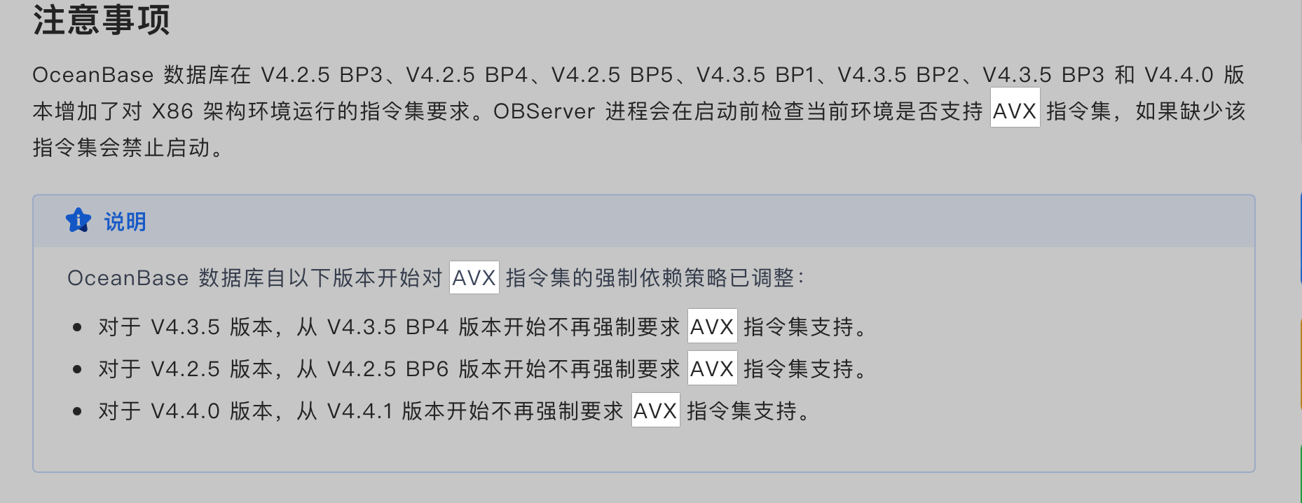 • 如果您的机器确实不支持 AVX 指令集,您可以尝试使用不依赖于 AVX 指令集的 OceanBase 版本。您可以检查 OceanBase 官方文档或社区是否有针对不支持 AVX 指令集的机器的特定版本或配置建议。