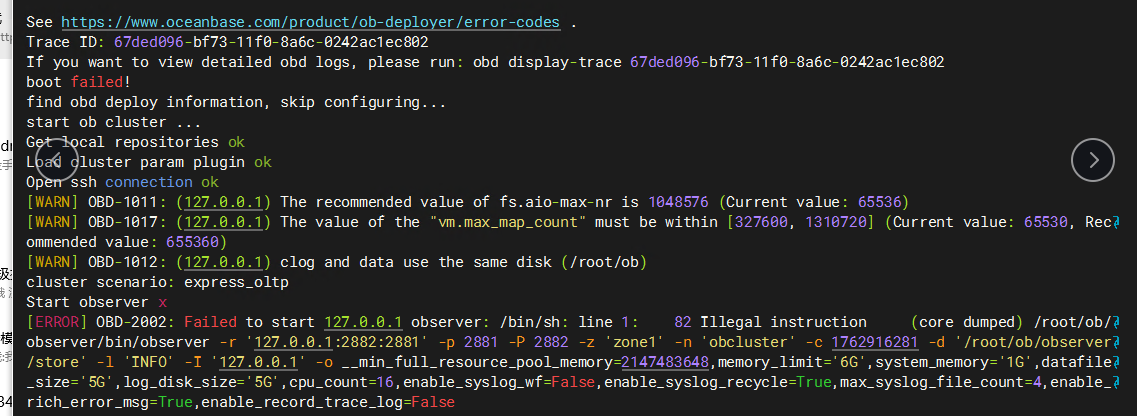 [ERROR] OBD-202: Failed to start 127.0.0.1 observer: /bin/sh: line 1: 82 Illegal instruction