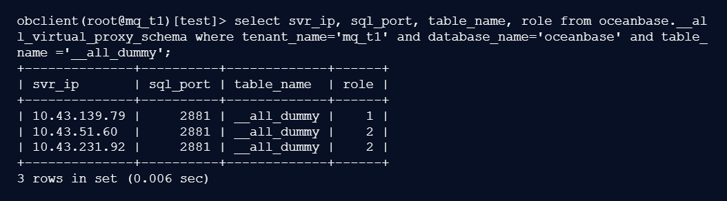 obclient [oceanbase]> select svr_ip,tenant_name,database_name,table_name,role from __all_virtual_proxy_schema where tenant_name='obmysql' and database_name='oceanbase' and table_name='__all_dummy';