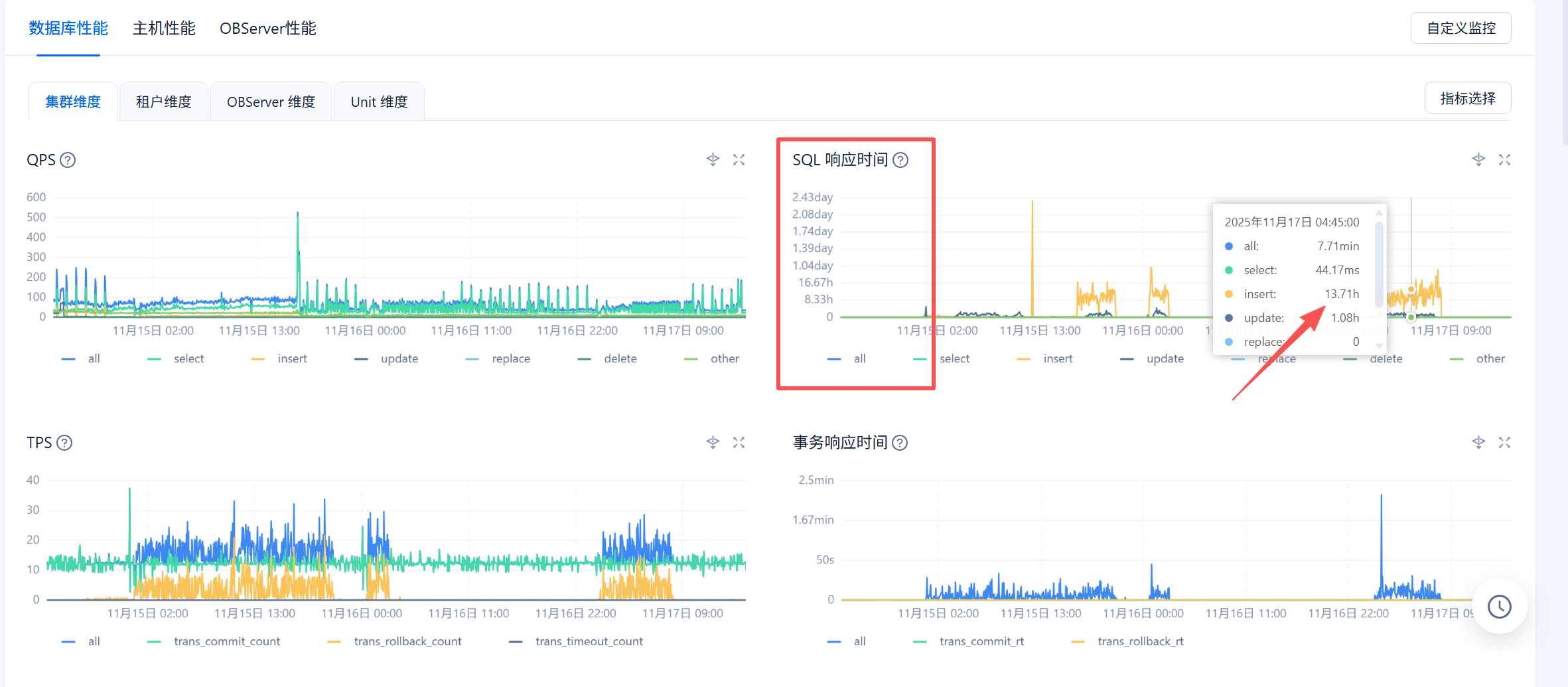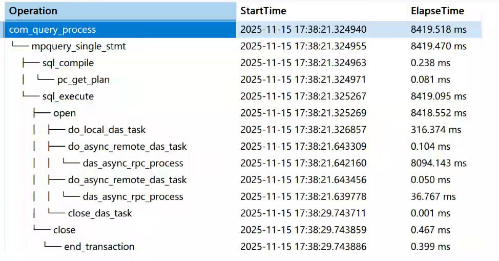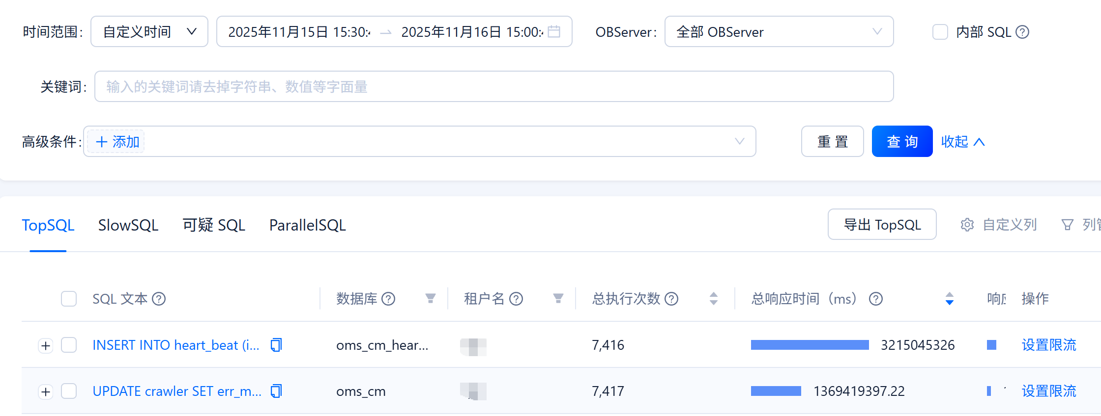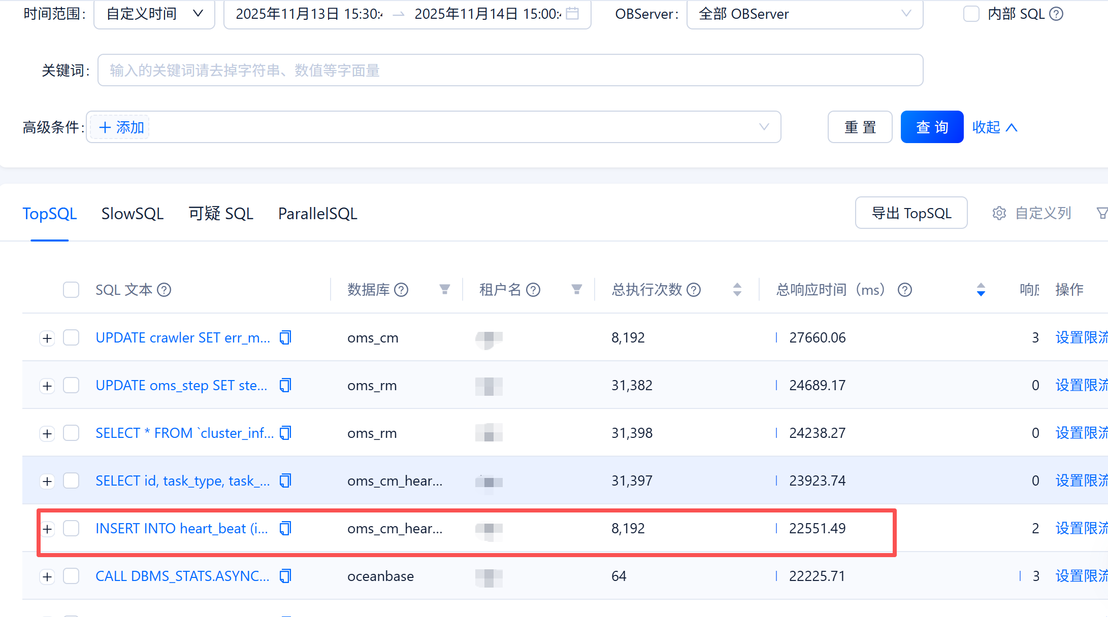下午发现 ob集群 SQL 写入特别慢 ,从ocp看 有慢查询的警告,相关写服务已经停止,服务器高负载没有下降,通过工具查看SQL 语句发现是卡在RPC ,如图: