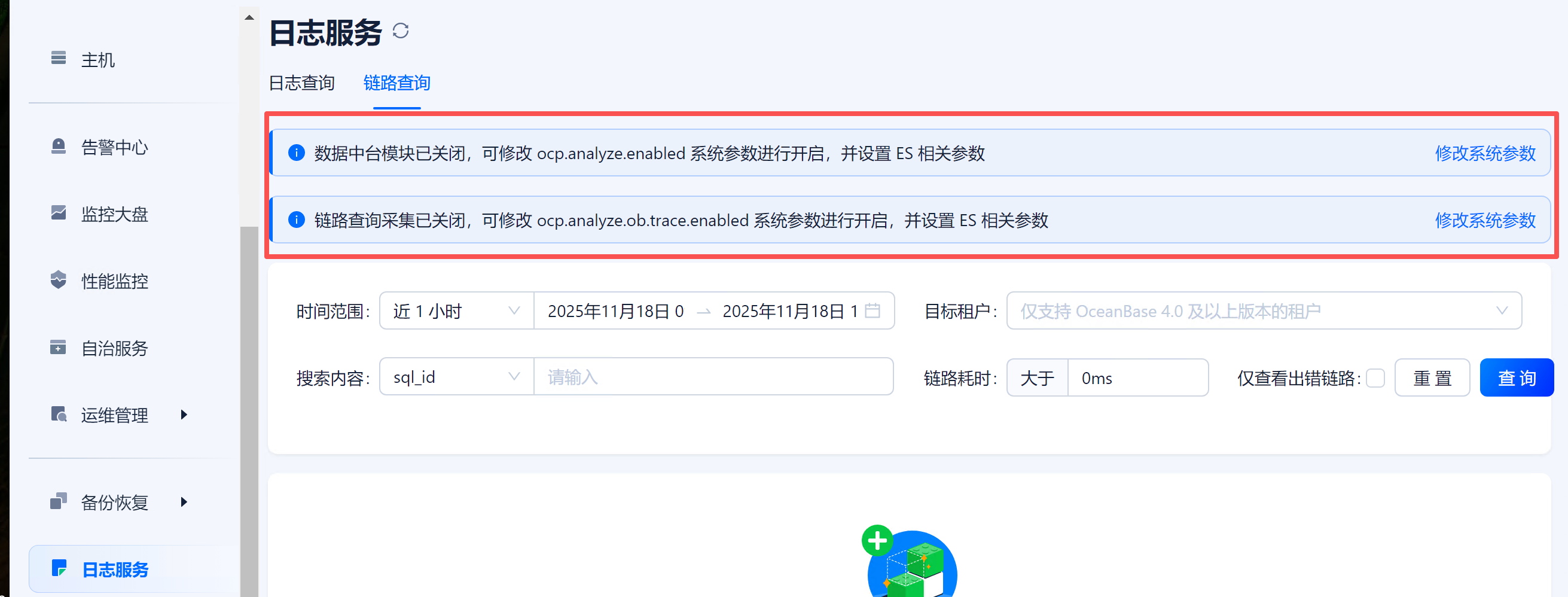 Caused by: org.springframework.beans.factory.UnsatisfiedDependencyException: Error creating bean with name 'logQuerier' defined in class path resource [com/oceanbase/ocp/analyze/configuration/AnalyzeConfiguration.class]: Unsatisfied dependency expressed through method 'logQuerier' parameter 0; nested exception is org.springframework.beans.factory.BeanCreationException: Error creating bean with name 'restHighLevelClient' defined in class path resource [com/oceanbase/ocp/analyze/configuration/AnalyzeConfiguration.class]: Bean instantiation via factory method failed; nested exception is org.springframework.beans.BeanInstantiationException: Failed to instantiate [org.opensearch.client.RestHighLevelClient]: Factory method 'restHighLevelClient' threw exception; nested exception is java.lang.IllegalArgumentException: hosts must not be null nor empty