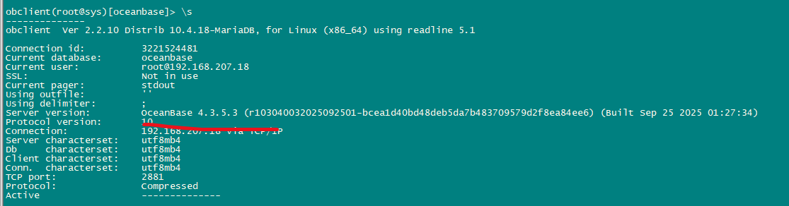 Server version: OceanBase 4.3.5.3 (r103040032025092501-bcea1d40bd48deb5da7b483709579d2f8ea84ee6) (Built Sep 25 2025 01:27:34)
