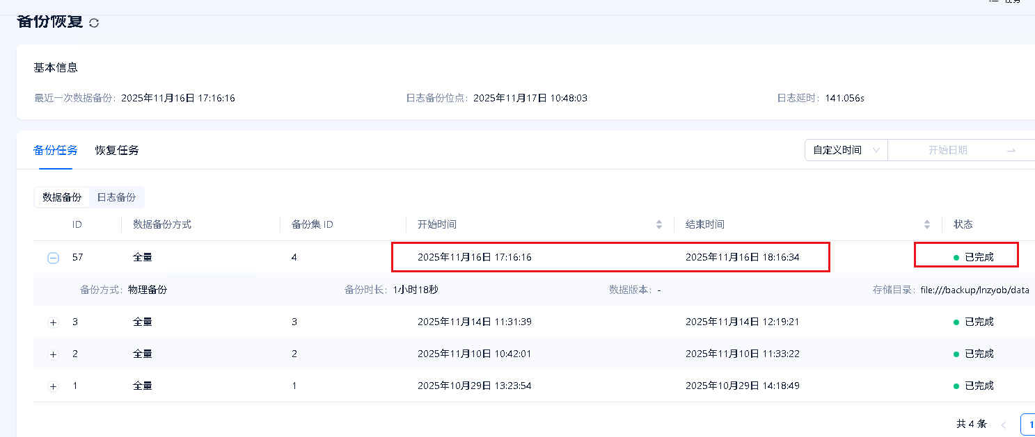 | 4 | 2025-11-16 17:16:16.700891 | 2025-11-16 18:16:34.651781 | SUCCESS | file:///backup/lnzyob/data |