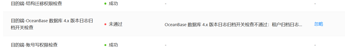 OceanBase 数据库 4.x 版本日志归档开关检查不通过:租户归档日志未打开,请在当前租户 htcl 下开启归档日志。