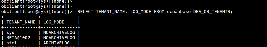 obclient(root@htcl)[(none)]> alter system archivelog;