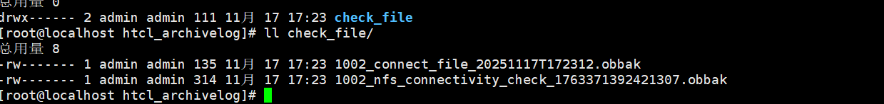 我通过NFS配置并挂载了/obbackup,三个节点在htcl_archivelog都有权限,