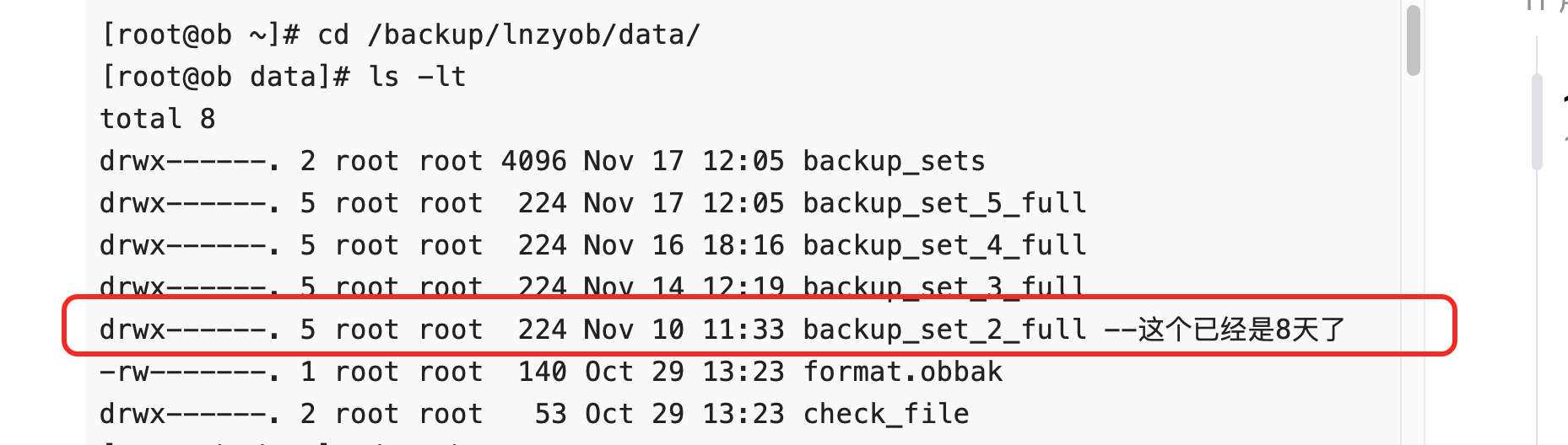 drwx------. 5 root root 224 Nov 10 11:33 backup_set_2_full --这个已经是8天了