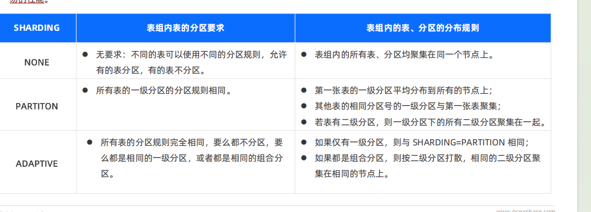 因为需要关联访问位于不同OBServer 服务器上的分区,查询的性能低下。 为了提升查询性能,用户决定使用表组来进行分区的聚合, 请选择合适的表组SHARDING 属性: