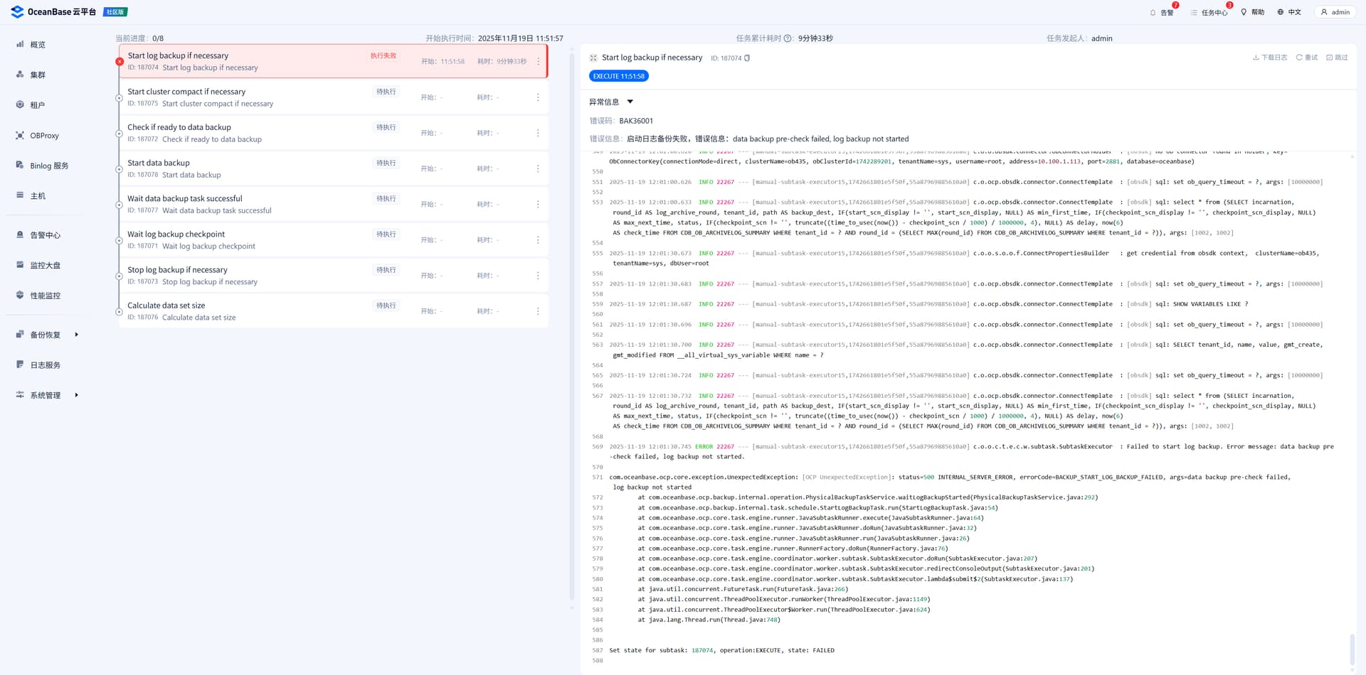 2025-11-19 10:48:39.454 ERROR 22267 — [manual-subtask-executor15,e80b3098cdba2f90,0717103e9b7e31c2] c.o.o.c.t.e.c.w.subtask.SubtaskExecutor : Failed to start log backup. Error message: data backup pre-check failed, log backup not started.