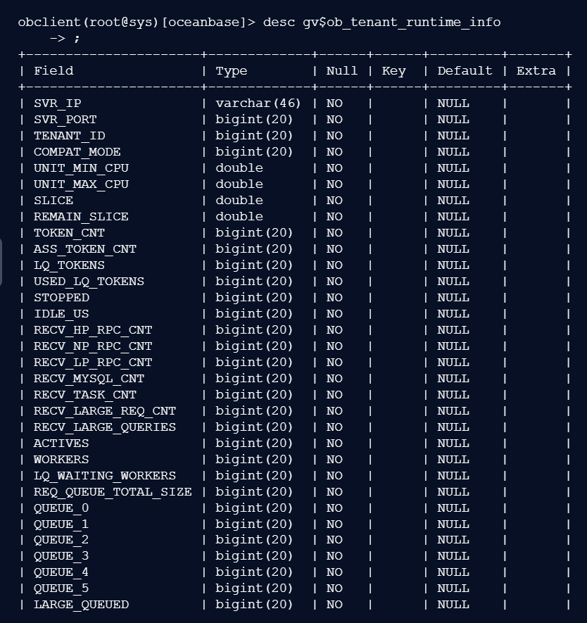 视图 GV$OB_TENANT_RUNTIME_INFO 从 V4.2.1 版本开始引入,主要用于展示租户线程中队列和线程限额相关的信息。以下是各字段的具体含义: