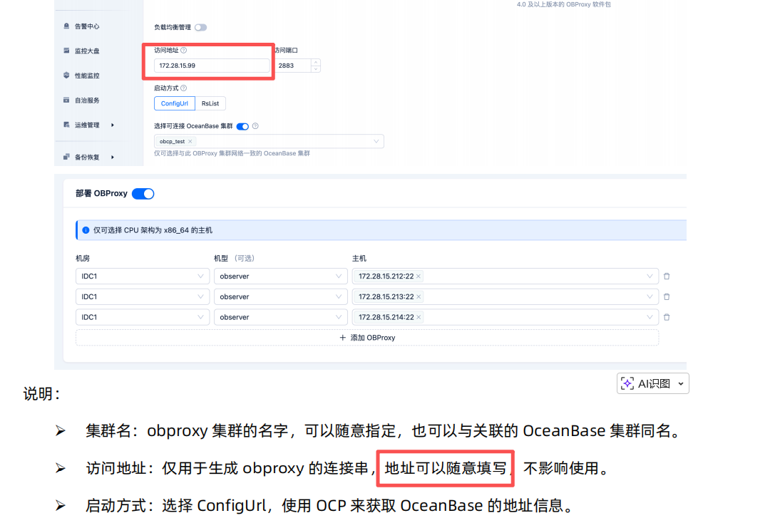 访问地址:仅用于生成 obproxy 的连接串,地址可以随意填写,不影响使用。