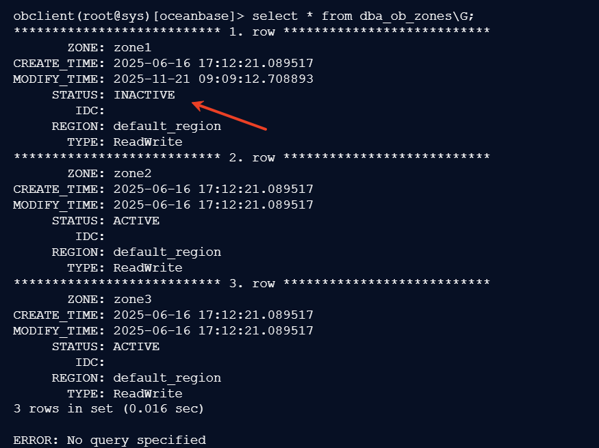 D STOP ZONE 会停止 Zone 内所有 OBServer 节点的服务