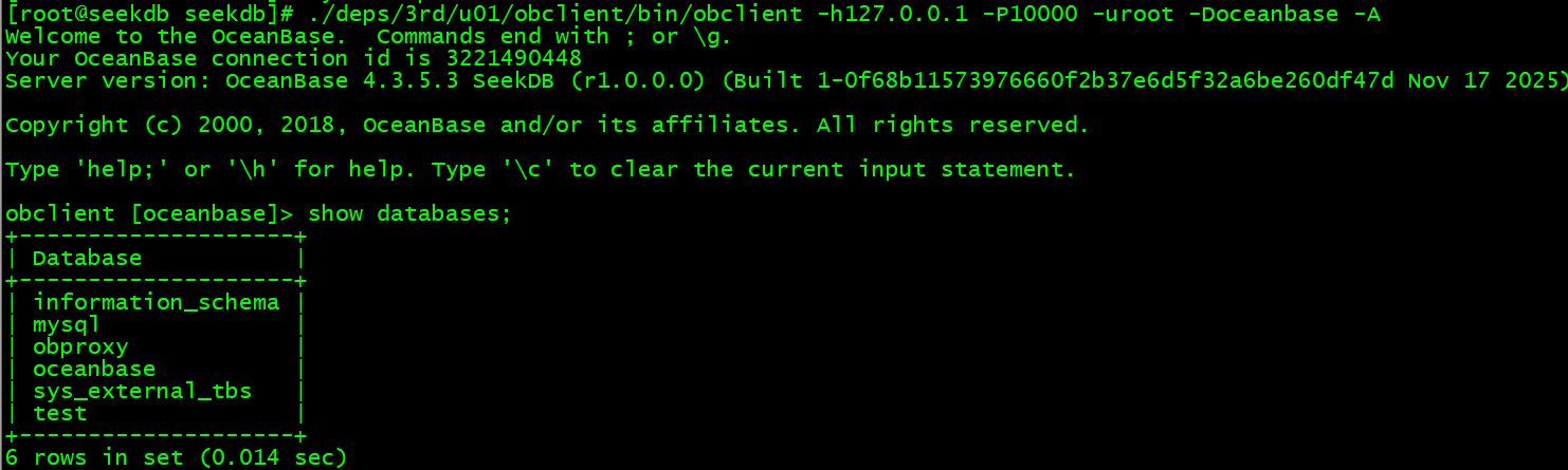 ./deps/3rd/u01/obclient/bin/obclient -h127.0.0.1 -P10000 -uroot -Doceanbase -A