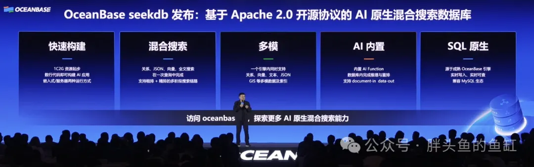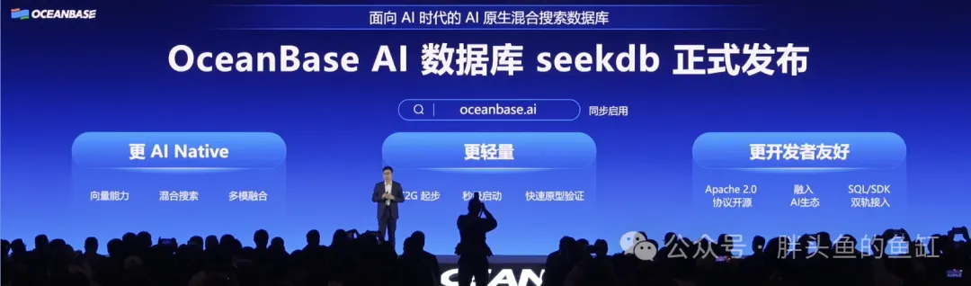 OceanBase seekdb也是昨天的重要发布内容之一,在昨天文章OceanBase seekdb,一个“小小”的野望中,简单介绍了OceanBase seekdb,并进行了部署。seekdb的发布填补了轻量级AI数据库的市场空白,仅需1C2G资源即可起步,秒级启动的特性让开发者能快速完成原型验证,同时与Dify、LangChain、Qoder等生态深度兼容。年度发布会下午进行的AI Workshop现场实操专场中,来自于OceanBase、LangChain和Dify的技术专家一道,基于seekdb成功快速构建Agentic RAG、AI应用以及具备上下文记忆的智能体,展现了其在快速开发AI应用场景中的强大潜力。seekdb可以在小规格场景中实现近似于全功能数据库的能力,小小的身躯承载了大大的野望。