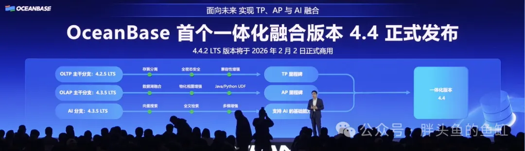 本次发布会还发布了OceanBase下一个LST版本4.4,作为OceanBase首个一体化融合版本,集成了4.2.5的TP能力与4.3.5的AP能力,彻底打破了事务与分析的之间的架构局限,实现了HTAP场景的数据库架构融合与升级。另一方面增强了向量检索和混合搜索功能,支持在一次查询中完成关系数据、非结构化数据的联合分析,大幅提升了复杂场景下的数据处理效率。这是OceanBase迈向“TP+AP+AI”融合的关键一步。