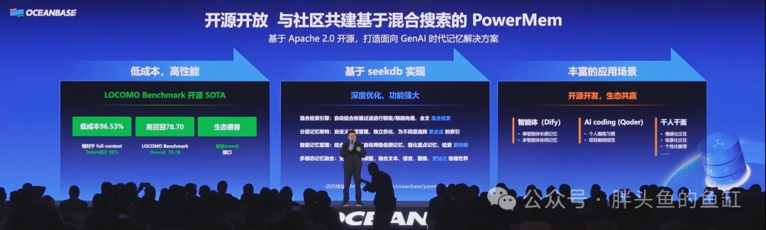 在去年发布PowerRAG之后,今年OceanBase又推出了PowerMem作为记忆上下文工程的核心部件,AI记忆组件是Agentic AI的必需基础设施,PowerMem使用Apache 2.0开源协议,采用分层记忆架构与智能记忆管理机制。其能自动降级低频记忆、强化重点记忆,结合混合检索引擎实现稠密/稀疏向量与全文的精准匹配。PowerMem 支持文本、语音、图像等多模态记忆融合,完美适配个人编程习惯与项目规范。PowerMem的发布展现了OceanBase对AI数据库的深刻理解。