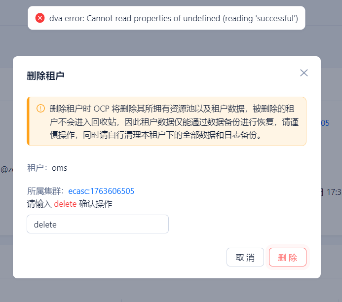 一台arm服务器部署了OCP,通过这个OCP在三台C86服务器上部署了一套OCEANBASE,并创建了集群casc,但是通过OCP删除租户和删除租户中数据库时报错