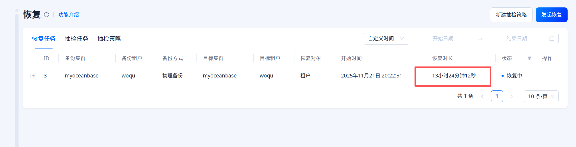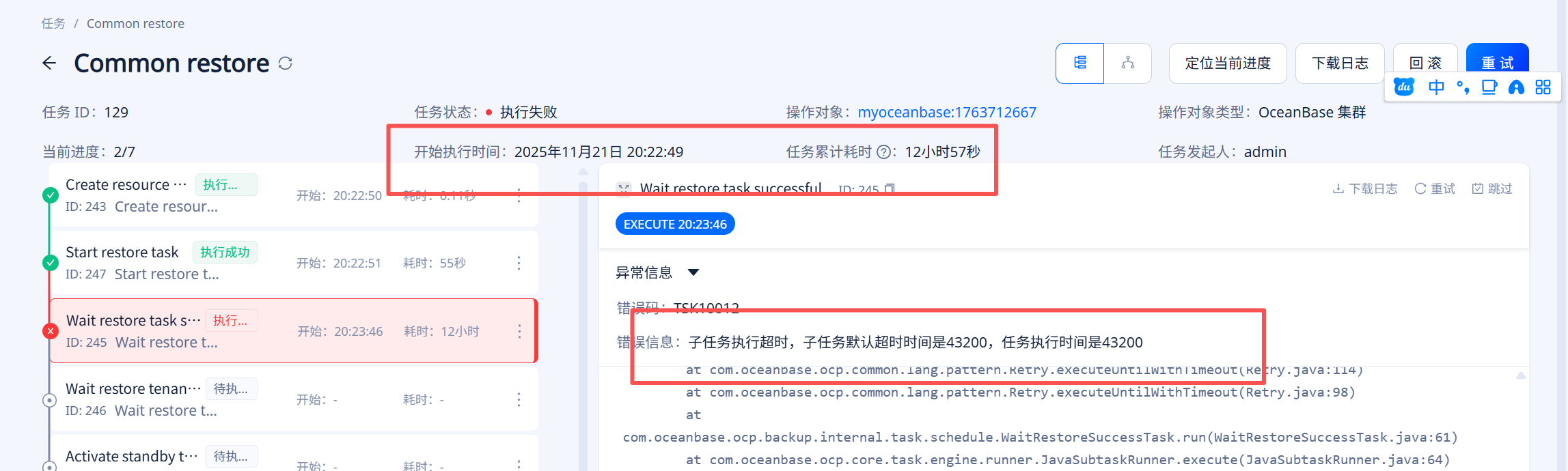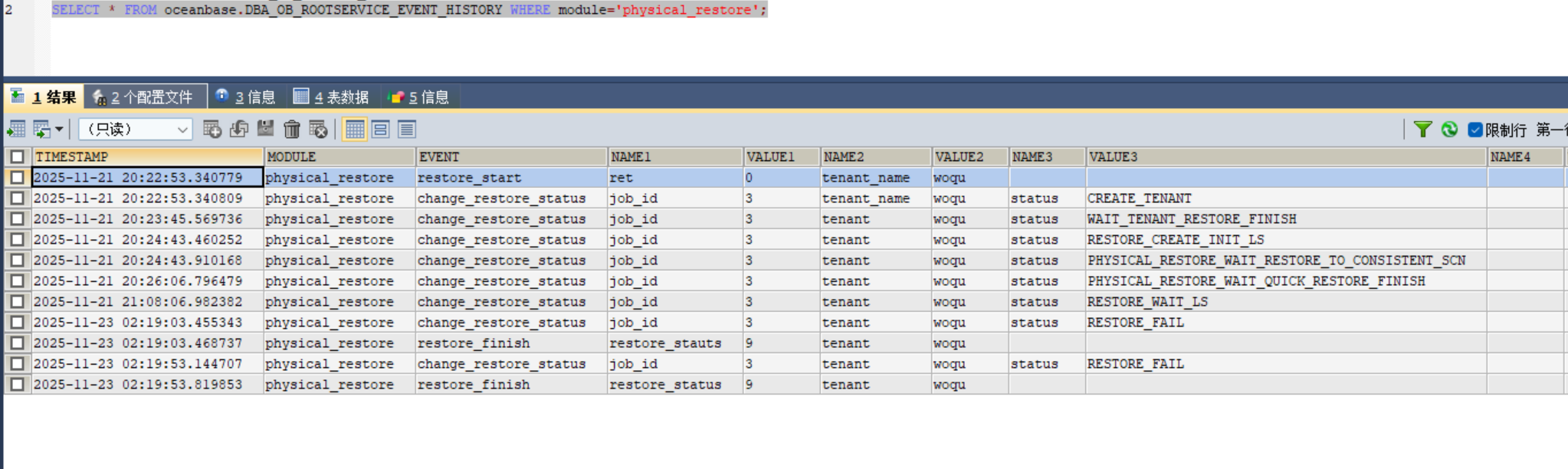 SELECT * FROM oceanbase.DBA_OB_ROOTSERVICE_EVENT_HISTORY WHERE module=‘physical_restore’;