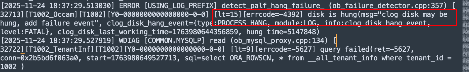 【问题描述】上周五我怕意外宕机,就手动关机了,但是今天启动还是启动不了了,alert日志提示ob_failure_detector.cpp:358|“clog disk may be hung, add failure event”
