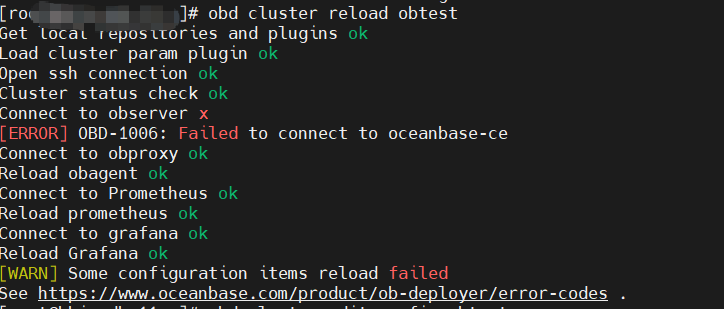 置后,执行obd cluster reload obtest报错,但是ps进程发现observer是启动的,也能连上,不知道为啥这里报错