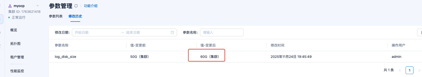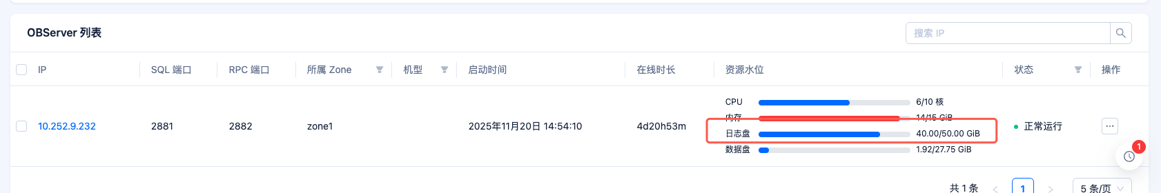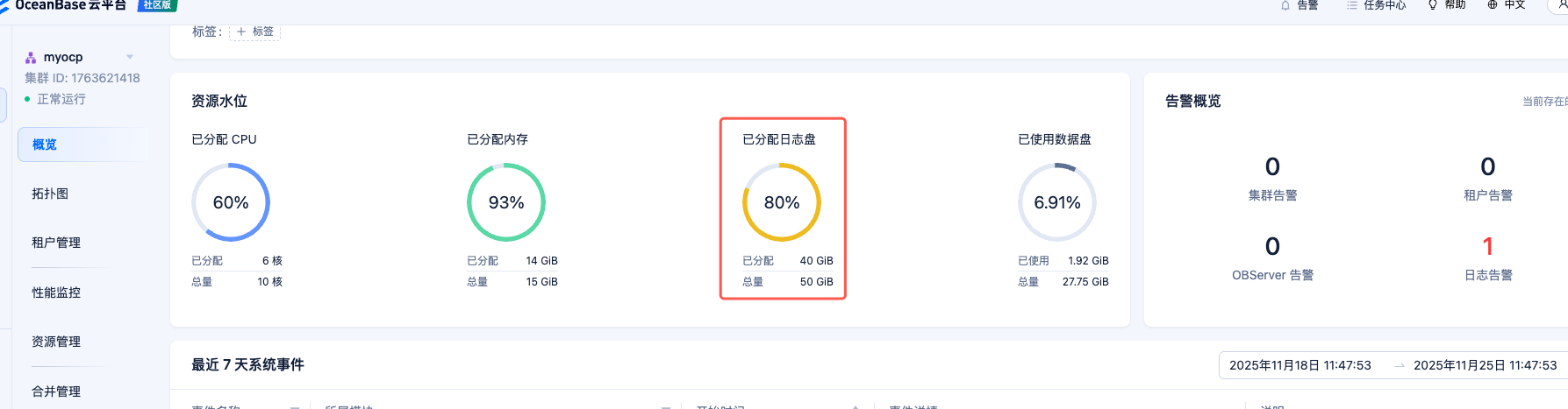 扩容日志大小是在线扩容的,实时生效。但是ocp探测ob是有定时任务的。想确认是否生效,可以先黑屏化查询一下GV$OB_SERVERS视图