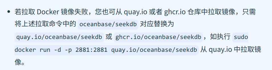 【问题描述】 按照https://www.oceanbase.ai/docs/zh-CN/deploy-by-docker/文档启动 seekdb 实例时,输入docker run -d -p 2881:2881 oceanbase/seekdb,但是报错,错误信息