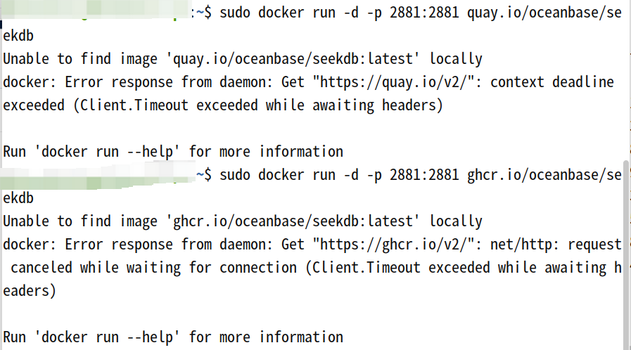 这个报错信息应该是访问 dockerhub 的网络问题,可以尝试使用 quay.io 上的镜像,把启动命令换成docker run -d -p 2881:2881 quay.io/oceanbase/seekdb 试一下