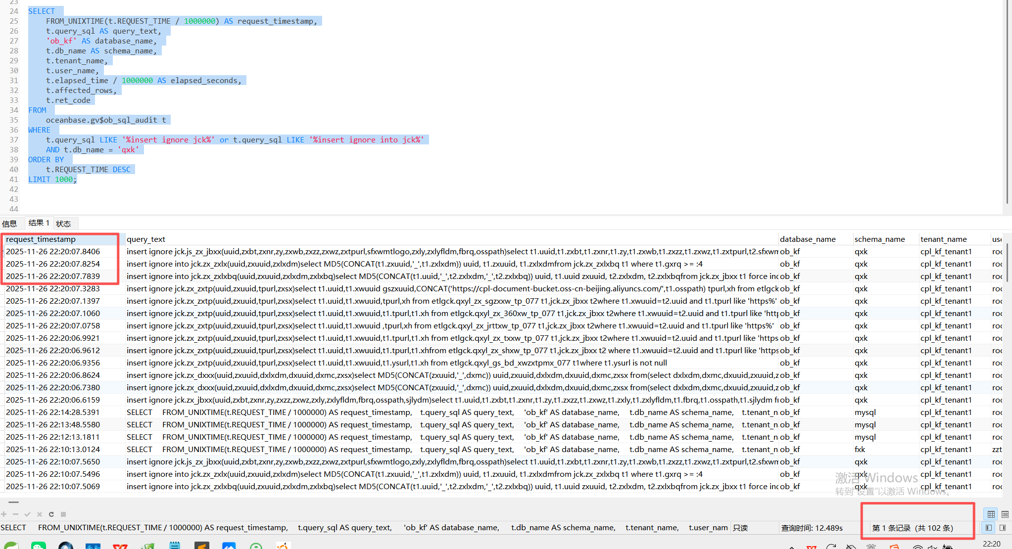 select FROM_UNIXTIME(t.REQUEST_TIME / 1000000),t.* from oceanbase.__all_virtual_sql_audit t order by REQUEST_TIME desc limit 1000;