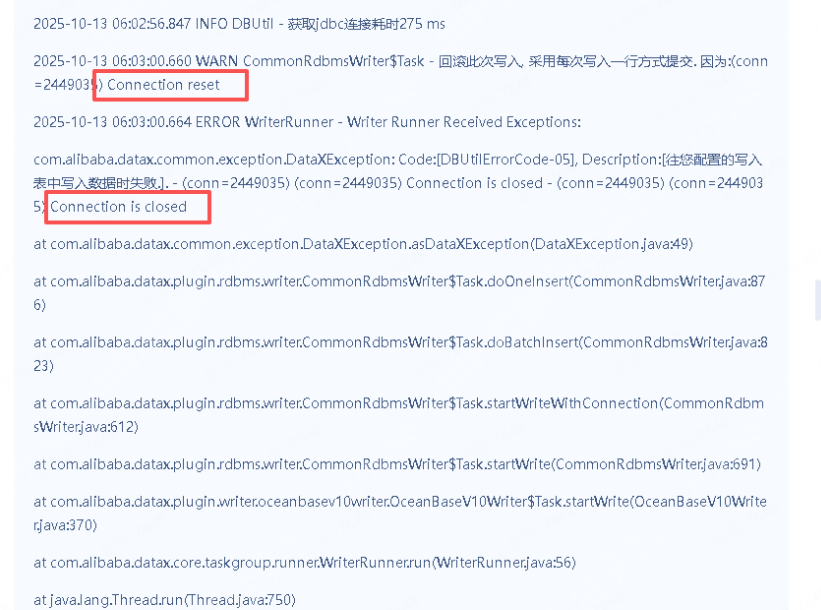 【问题描述】使用DataX 的oceanbasev10writer写入插件,采用的jdbc连接,写入数据过程中,出现异常报错,报错信息为 (conn=2449035)Connection reset或者Connection is closed ,每天会有成功的任务,但是也有失败出现异常的情况,请问这是哪里的问题?并且如何尝试解决这个问题?请给与指导