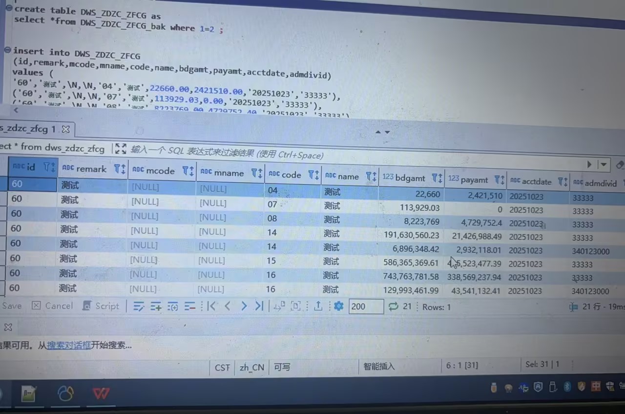 DWS_ZDZC_ZFCG表的结果和表数据发出来几行看一下。