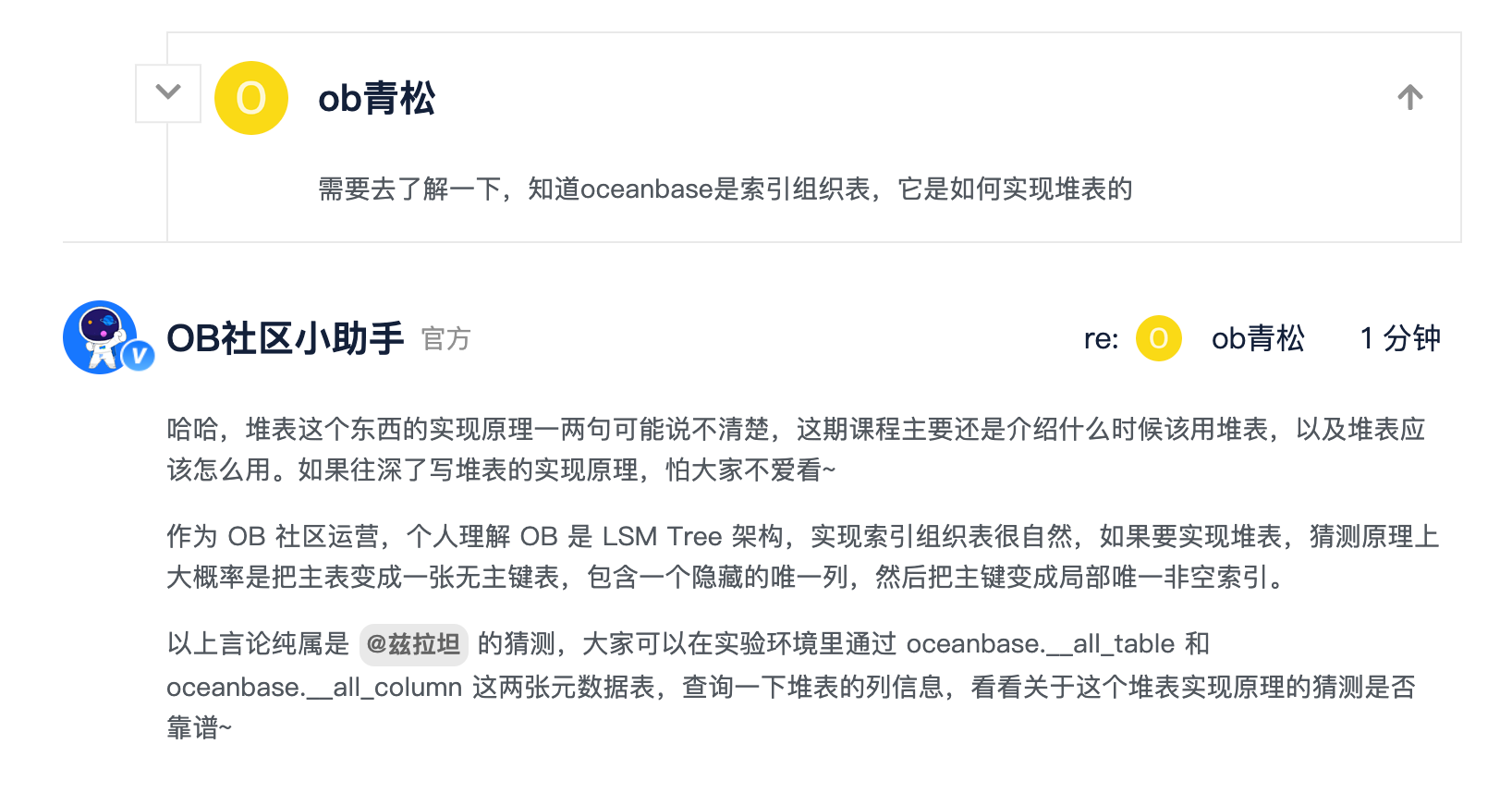看到这个帖子的评论区有老师希望了解 OceanBase 中堆表的实现原理,个人理解,对原理感兴趣的老师们,可以自行在实验环境里通过元数据表分析出个八九不离十(可以参考《临时表》 这期通过元数据信息倒推实现原理的方式)。