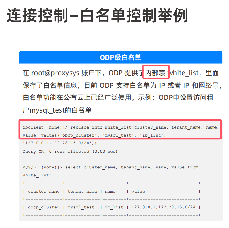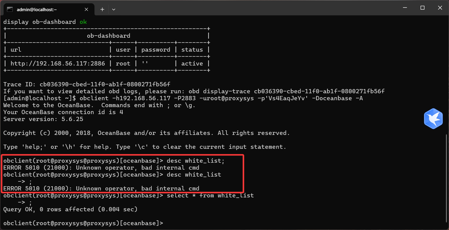 怎么查询obproxy租户proxysys中有哪些内部表?又是怎么知道white_list表有多少列?desc命令报错了?