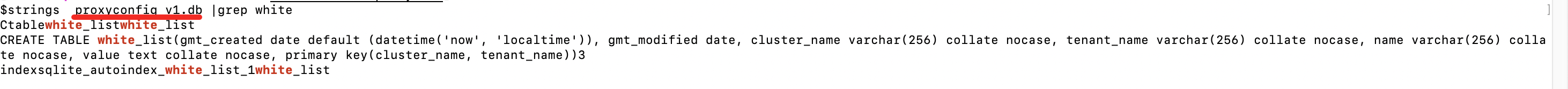 [admin@localhost ~]$ strings ./obproxy/etc/proxyconfig_v1.db | grep “CREATE TABLE”
