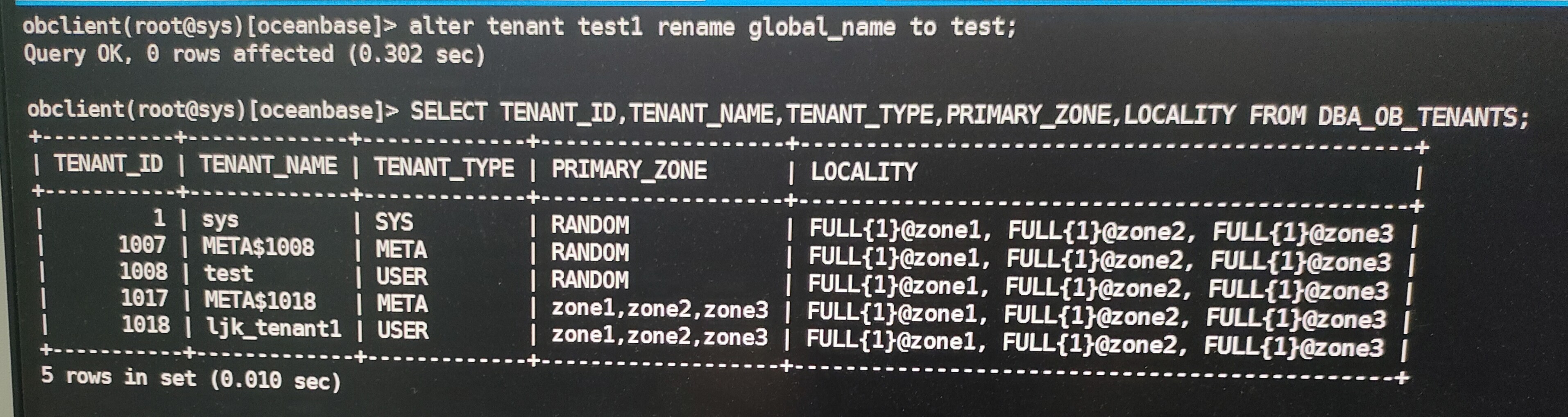 1.登录observer节点操作,连接sys租户,执行以下命令:
