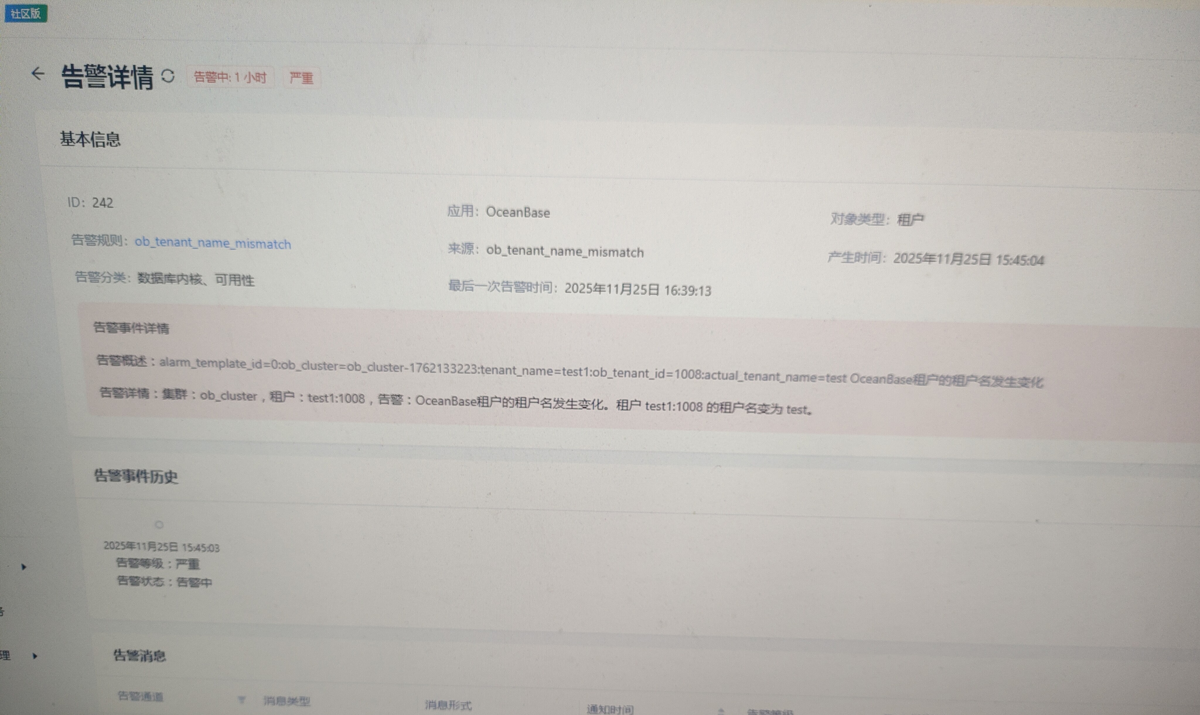 2.登录ocp平台,查看租户名字有没有变更,发现名字没有变更成功,并且存在一条租户名称变更的告警信息
