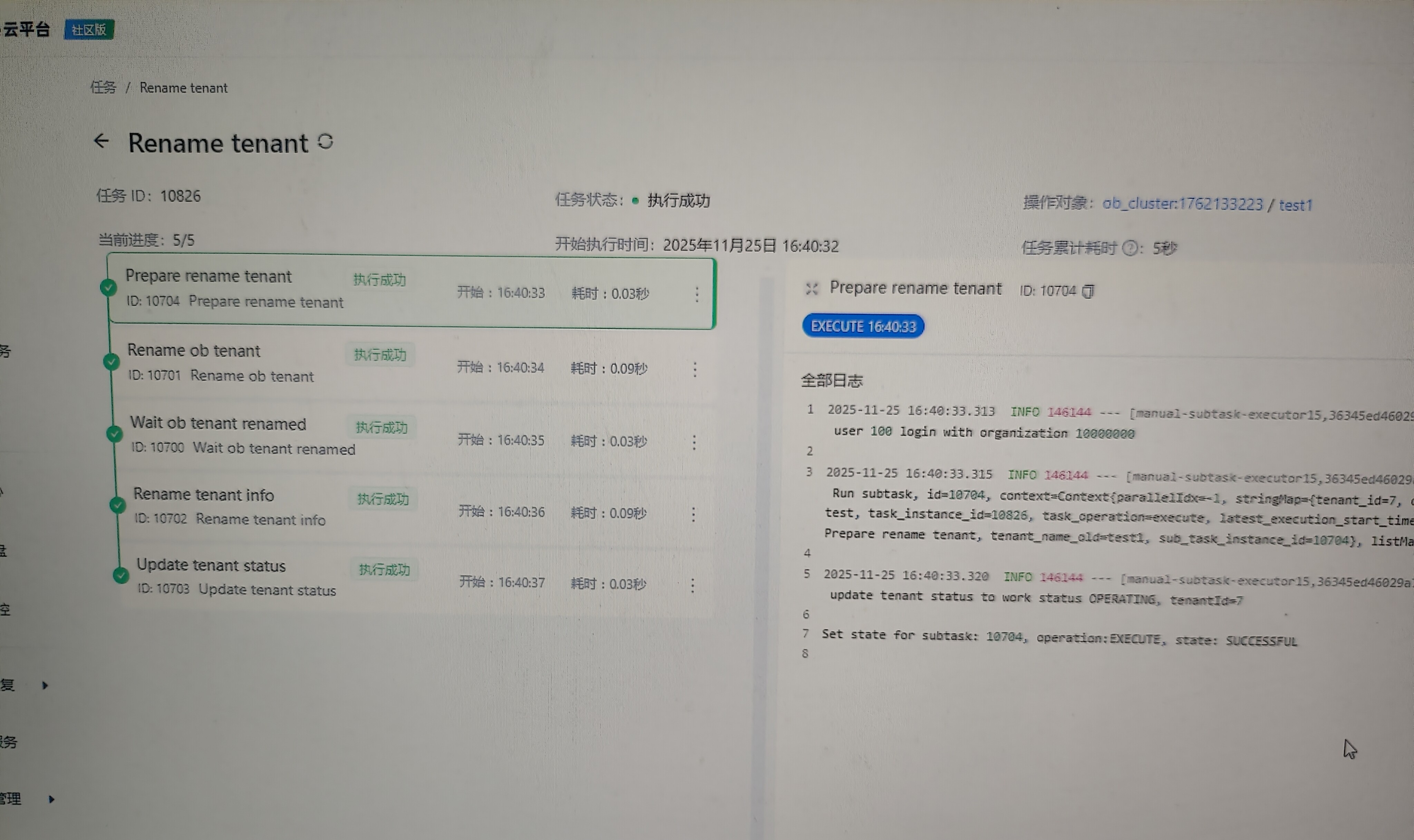 对此,建议优化Observer节点与OCP平台的同步机制:一方面,让Observer节点的租户名称变更操作自动触发OCP元数据的实时更新;另一方面,在OCP中增设定期校验逻辑,对比底层数据库与平台存储的租户信息并自动修正差异,以此消除操作断层,提升用户的运维操作流畅度。当前可通过OCP平台租户概览的重命名功能手动完成名称同步。