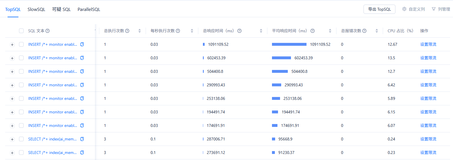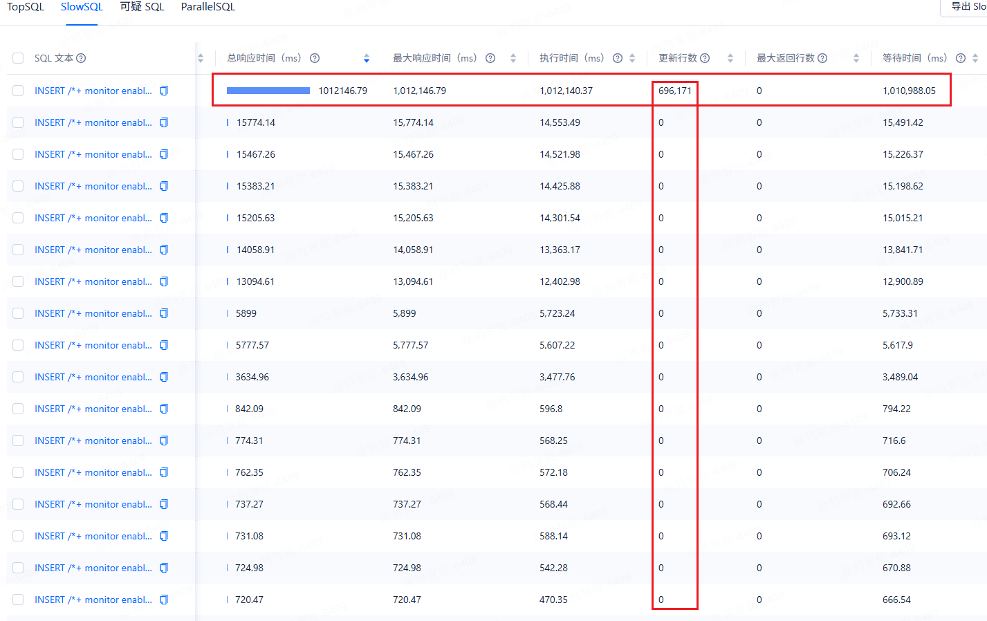 你好,今天又出现这问题了,跟其它这类 sql 对比了,这条 sql 执行时更新了大量数据,其它 sql 没有,执行时间就很长,资源方面没看到有啥瓶颈,有其它排查方向吗
