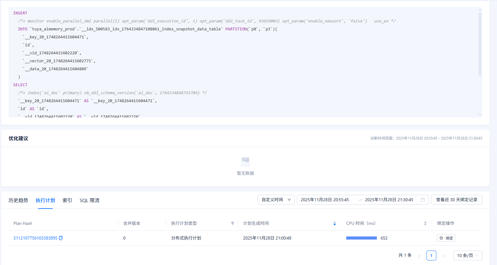 QUERY_SQL: INSERT /*+ monitor enable_parallel_dml parallel(1) opt_param(‘ddl_execution_id’, 2) opt_param(‘ddl_task_id’, 59522304) opt_param(‘enable_newsort’, ‘false’) use_px /INTO tuya_aimemory_prod.__idx_500612_idx_1765766796854809_index_id_table PARTITION(M202506,M202509,P202512,P202603)(__scn_26_1753843499651391, __vid_1753843499647861, __type_26_1753843499648191, biz_time, __vector_26_1753843499648596) SELECT / + index(ai_memory_alphago_memory_fact primary) ob_ddl_schema_version(ai_memory_alphago_memory_fact, 1765766797204232) / __scn_26_1753843499651391 AS __scn_26_1753843499651391, __vid_1753843499647861 AS __vid_1753843499647861, __type_26_1753843499648191 AS __type_26_1753843499648191, biz_time AS biz_time, __vector_26_1753843499648596 AS __vector_26_1753843499648596 from tuya_aimemory_prod.ai_memory_alphago_memory_fact PARTITION(M202506,M202509,P202512,P202603) as of snapshot 1765766797402245001 order by 1, 2, 3