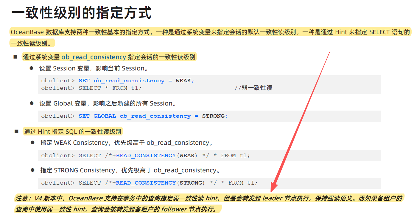 | 弱读 Hint 为何还走 Leader? | OBProxy 默认使用“主备均衡”策略,允许弱读在 Leader/Follower 间均衡负载;可通过 proxy_route_policy='follower_first' 改为优先读 Follower。 |