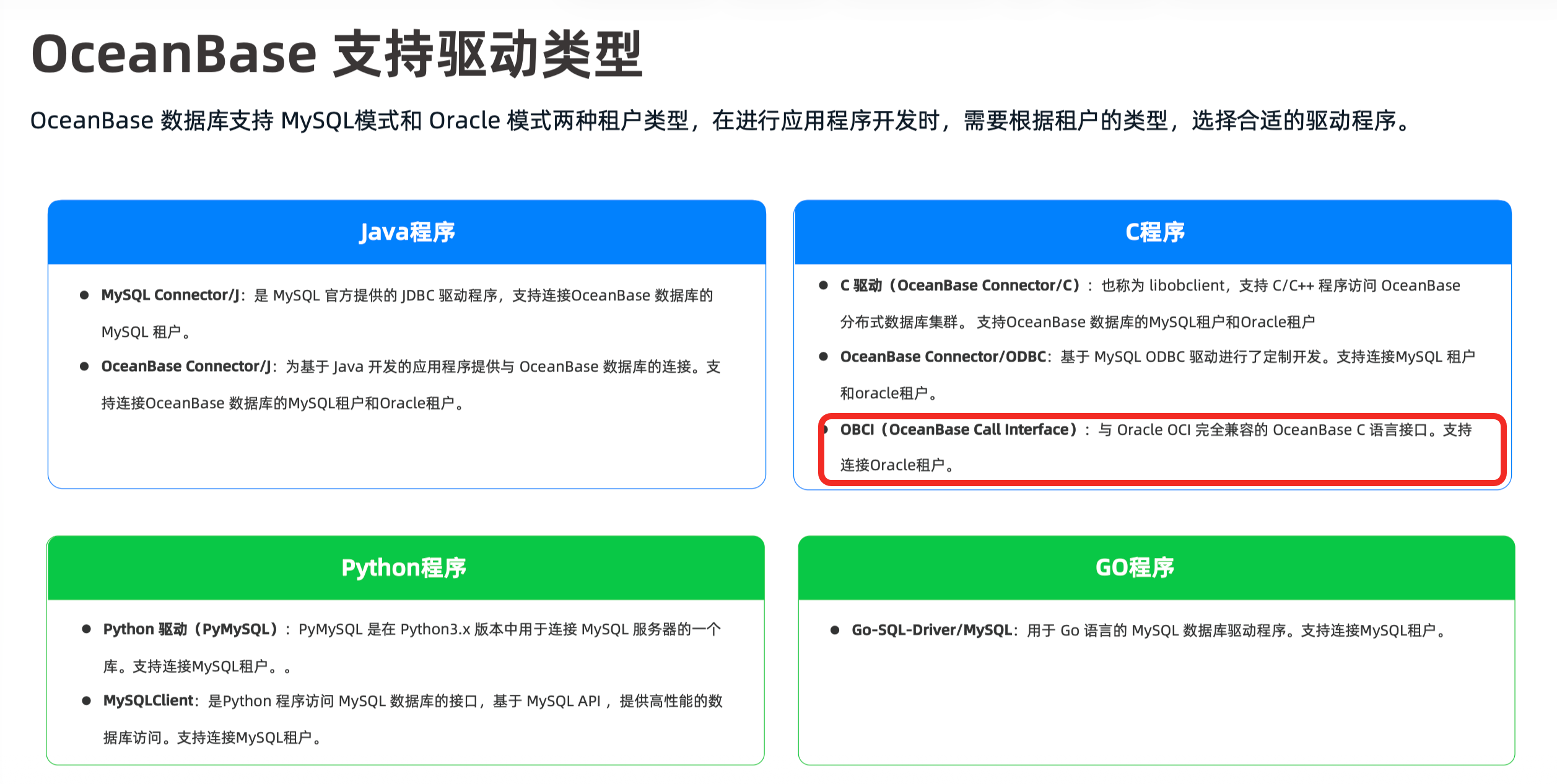 OBCI(OceanBase Call Interface)驱动程序支持连接mysql租户和oracle租户。