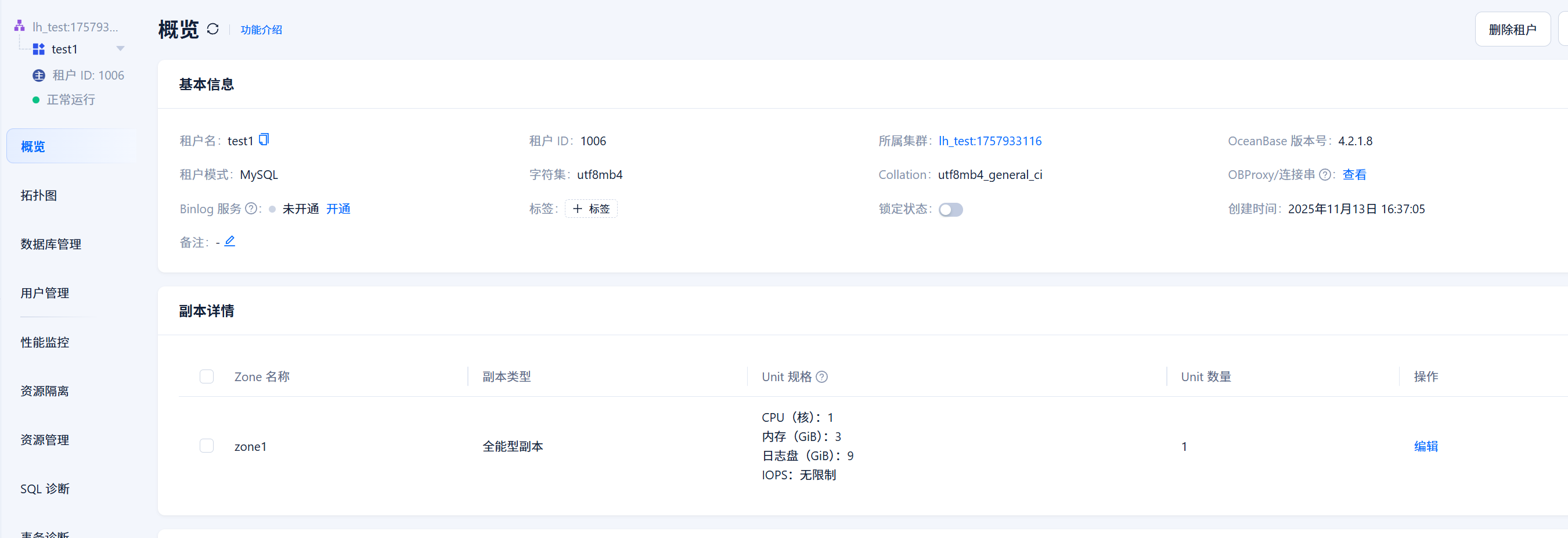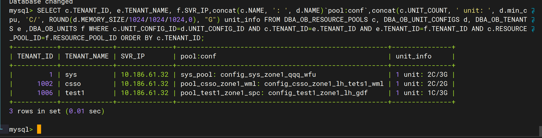SELECT c.TENANT_ID, e.TENANT_NAME, f.SVR_IP,concat(c.NAME, ': ', d.NAME)`pool:conf`,concat(c.UNIT_COUNT, ' unit: ', d.min_cpu, 'C/', ROUND(d.MEMORY_SIZE/1024/1024/1024,0), "G") unit_info FROM DBA_OB_RESOURCE_POOLS c, DBA_OB_UNIT_CONFIGS d, DBA_OB_TENANTS e ,DBA_OB_UNITS f WHERE c.UNIT_CONFIG_ID=d.UNIT_CONFIG_ID AND c.TENANT_ID=e.TENANT_ID AND e.TENANT_ID=f.TENANT_ID AND c.RESOURCE_POOL_ID=f.RESOURCE_POOL_ID ORDER BY c.TENANT_ID;
