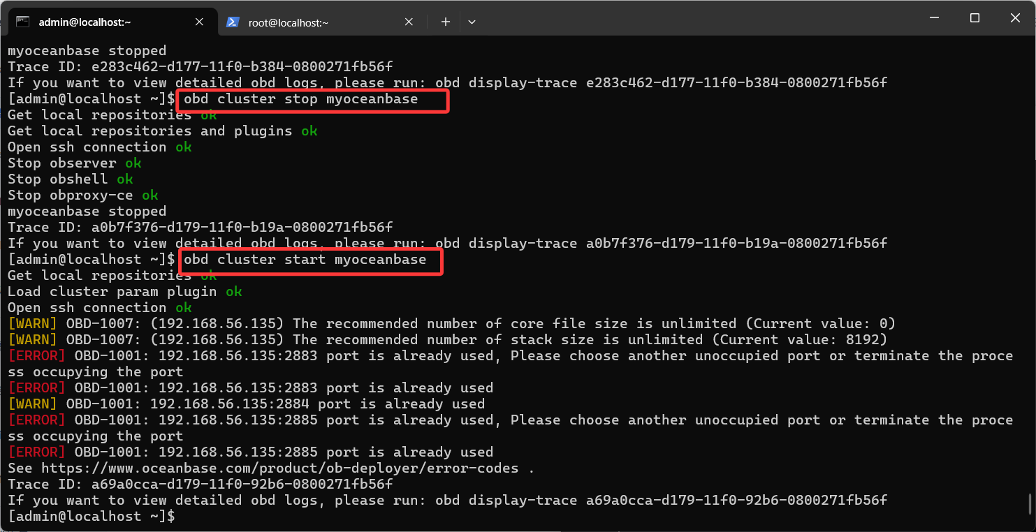 集群被OCP接管后,晚上关机了,早上使用obd先关闭再启动就报端口被占用了?