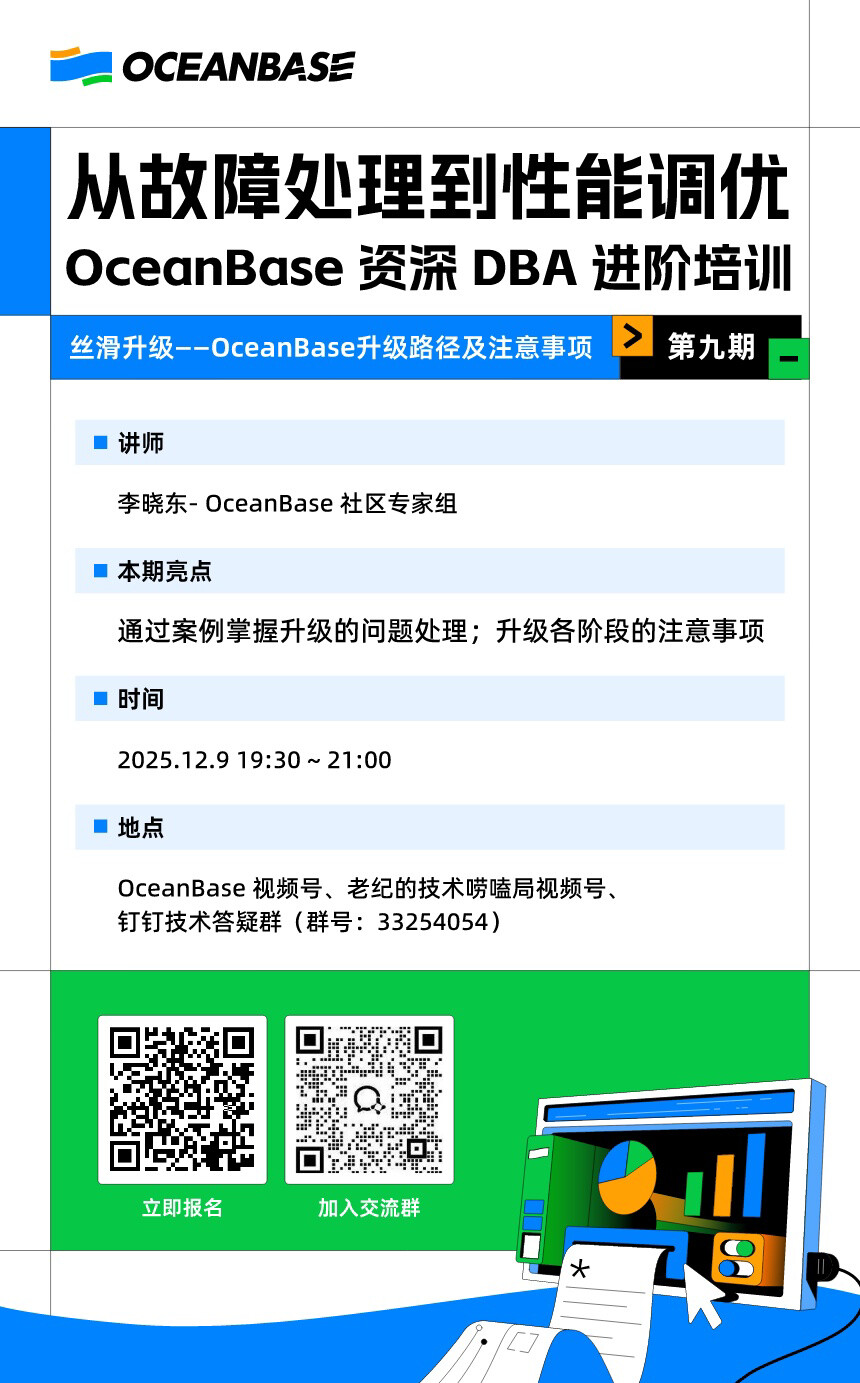 12月9日 19:30《从故障处理到性能调优:OceanBase资深DBA进阶培训》第九期,带你掌握OceanBase丝滑升级的秘诀