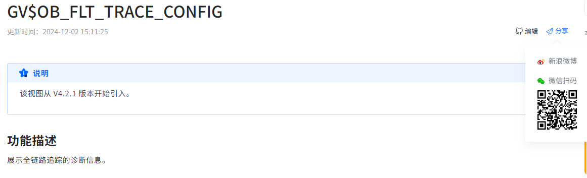 从官方文档上来看A和C都包含全链路Trace信息的字段LEVEL、SAMPLE_PERCENTAGE、RECORD_POLICY,且描述一模一样都包含“会话”,这几个字段也是随着GV$OB_FLT_TRACE_CONFIG的引入而引入的。